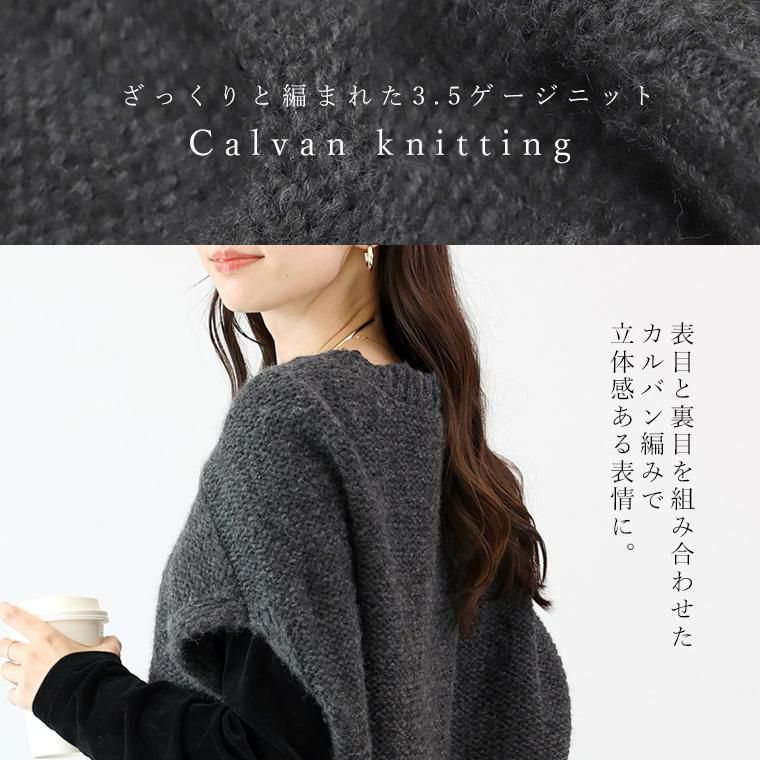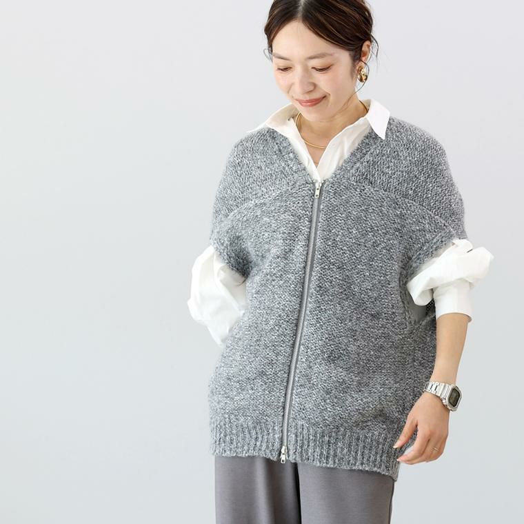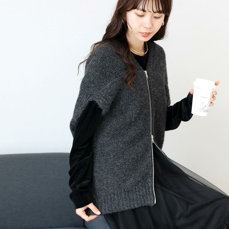 秋冬のレイヤードコーデにおすすめしたいニットベスト。表目と裏目を組み合わせた立体感あるカルバン編みで立体感のある編地。ざっくり編まれた3.5ゲージでふっくら温かみのある表情をみせます。フロントのシルバージップがアクセント。上下どちらからも開けられるダブルジップデザインで、シルエットを好みで調節。中に合わせるアイテムでレイヤードスタイルをたっぷり楽しめます。ワイド×コクーンのゆったりとしたラインで体型カバーしながらも上品に。長めの着丈を活かしてスタイルアップ効果も期待。大胆なドロップショルダーとワイドシルエットが大人のこなれ感を作る、変形ニットベストです。