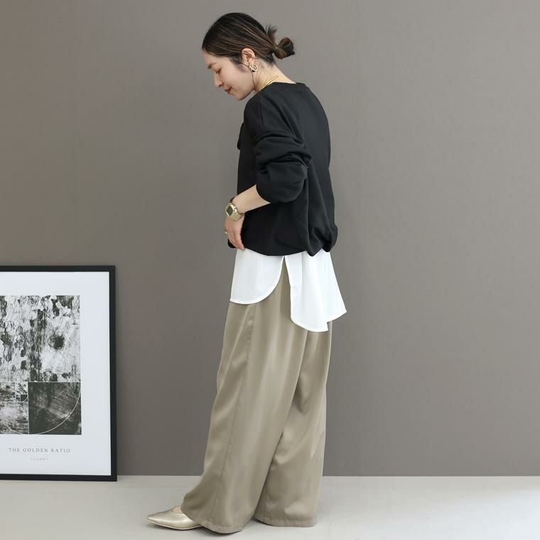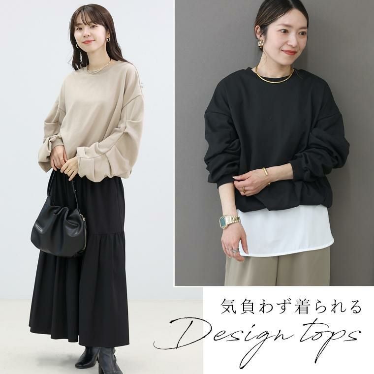 立体タックと裾バルーンが映える、上品カジュアルなプルオーバー。立体的なカーブスリーブが肩や腕のラインを美しく魅せ、女性らしい立体感を演出します。技いらずで自然なブラウジング感が出る裾デザインもポイント。程よくカジュアル感のあるT/C裏毛素材に、身頃だけ伸縮性のある裏地をプラスし快適な着心地に仕上げました。襟元と袖口はリブ仕様でフィット感を保ちながら、すっきりとしたシルエットをキープ。パンツにもスカートにも合わせやすく、気負わず着られる大人の万能トップスです。