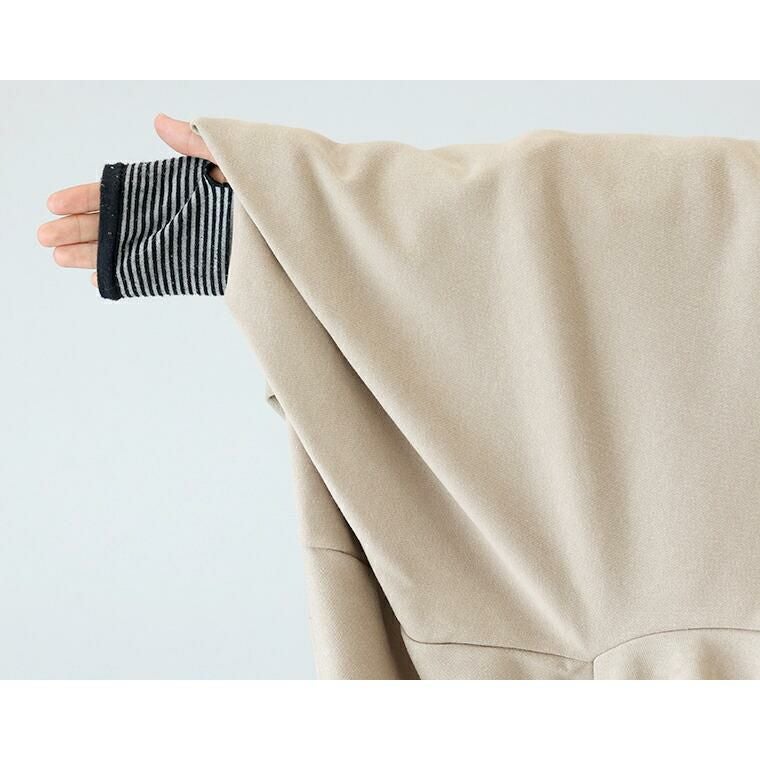 着丈はヒップが3分の1隠れるくらい。袖丈は手首から18cm下。生地は二重になっていて見た目よりやや重みがあります。裾はバルーンになっていてお腹まわりをカバーしてくれます。