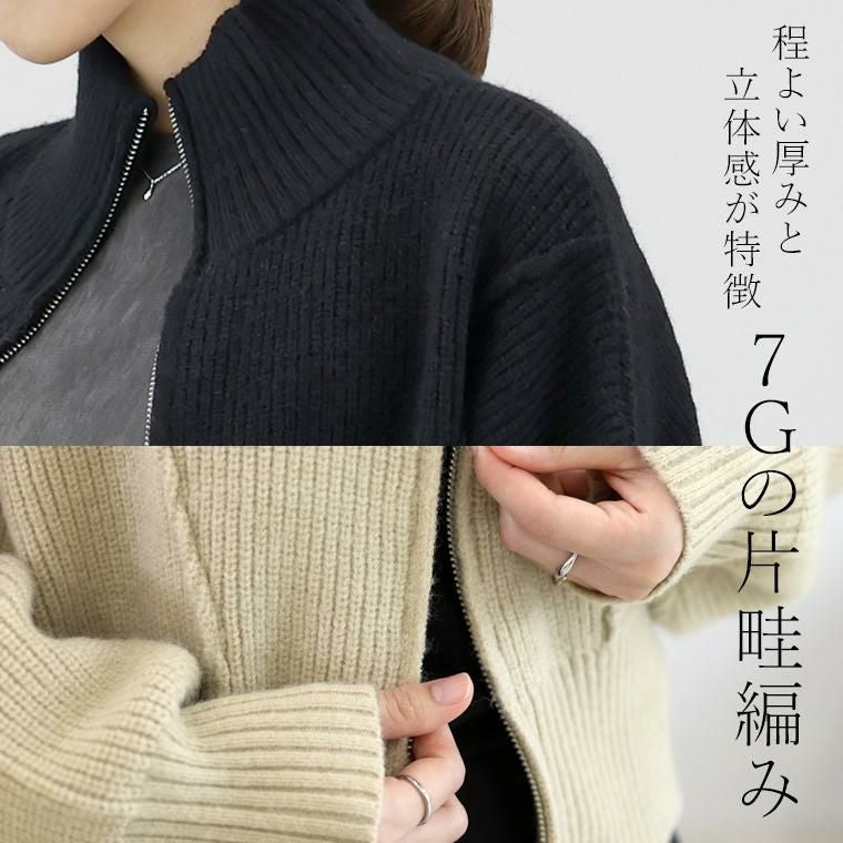ジャケットほどかっちりせず、カーデよりきちんと見えるニットブルゾン。7Gの片畦編みで程よい厚みと立体感が上品なフォルムをつくります。ドルマン×クロップド丈で、体型をカバーしながらスタイルアップにも効果的。ドルマンシルエットが肩まわりを自然にカバー、肩から裾にあしらったリンキングラインが縦を強調して、すっきり見えします。着方のアレンジがしやすいダブルジップ付き。きれいめボトムにもデニムにも合わせやすい着回し力抜群の一枚です。