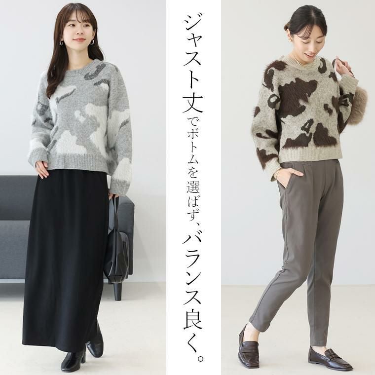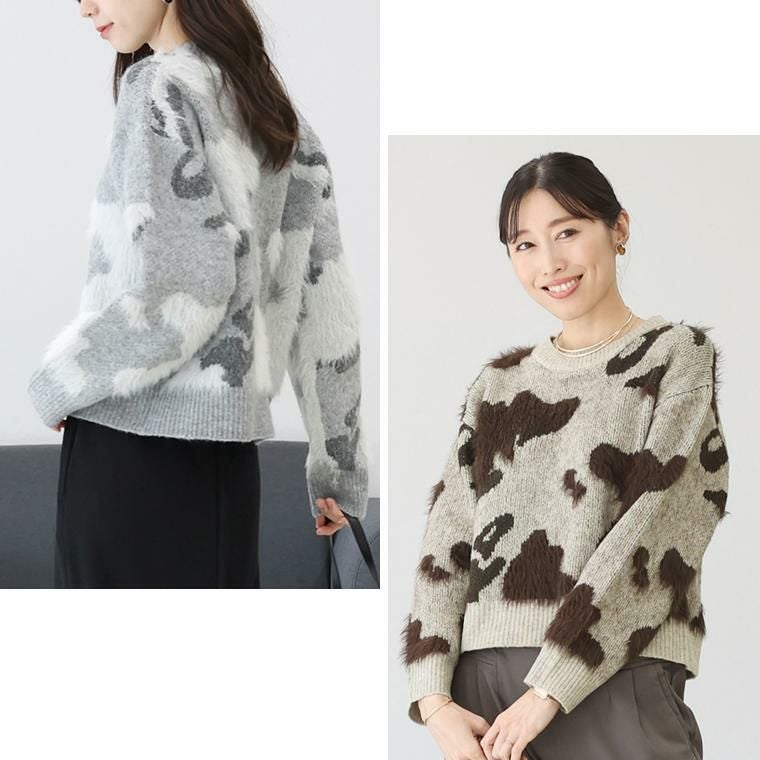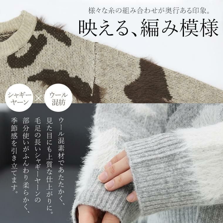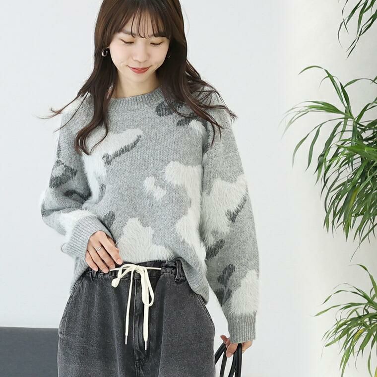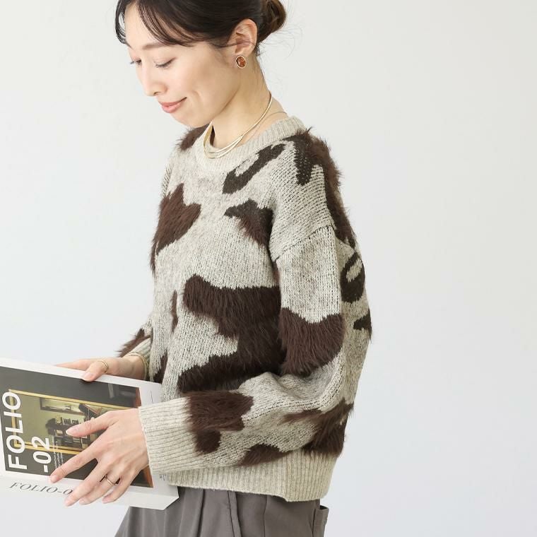 カモフラ調のニュアンス柄が印象的なニットプルオーバー。様々な糸を組み合わせた編み柄がマンネリ感を払拭、ふわっとした毛足の長いシャギーが季節感を引き立てます。ウール混紡で着心地は暖か、肌の露出を抑えたクルーネックが洗練された雰囲気です。整ったバランスで着られるワイドな身幅とジャストな着丈。トレンドを取り入れつつも、長く愛用できる大人の為のデザイントップスです。