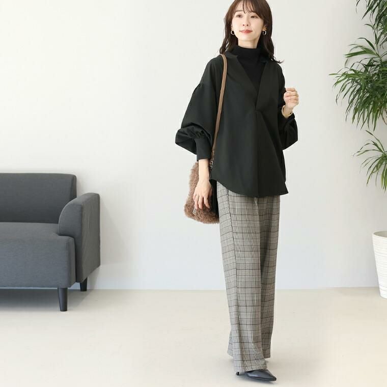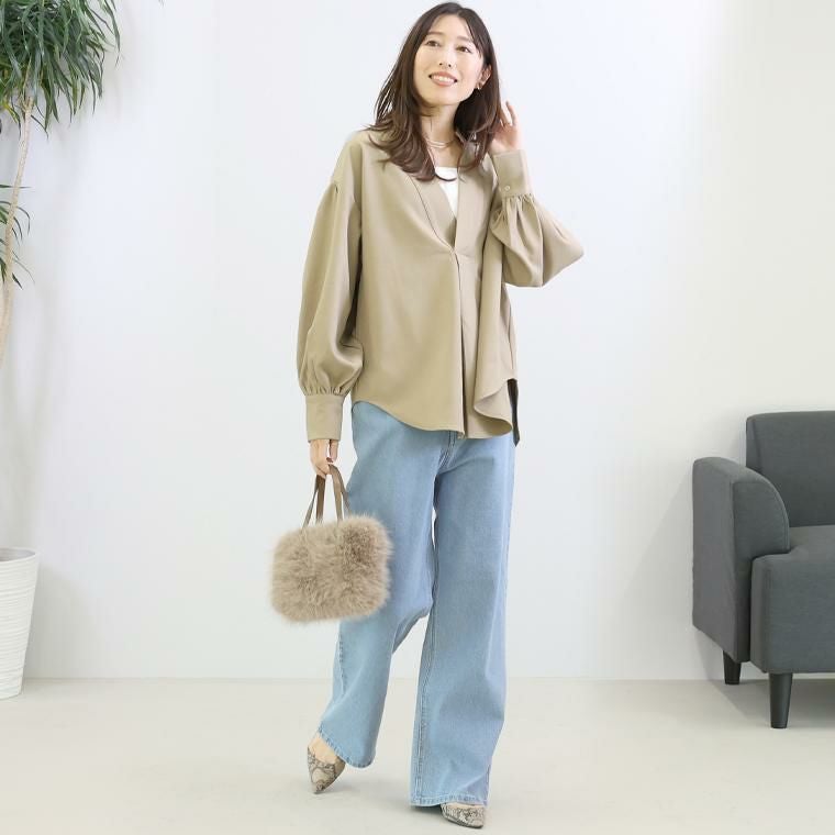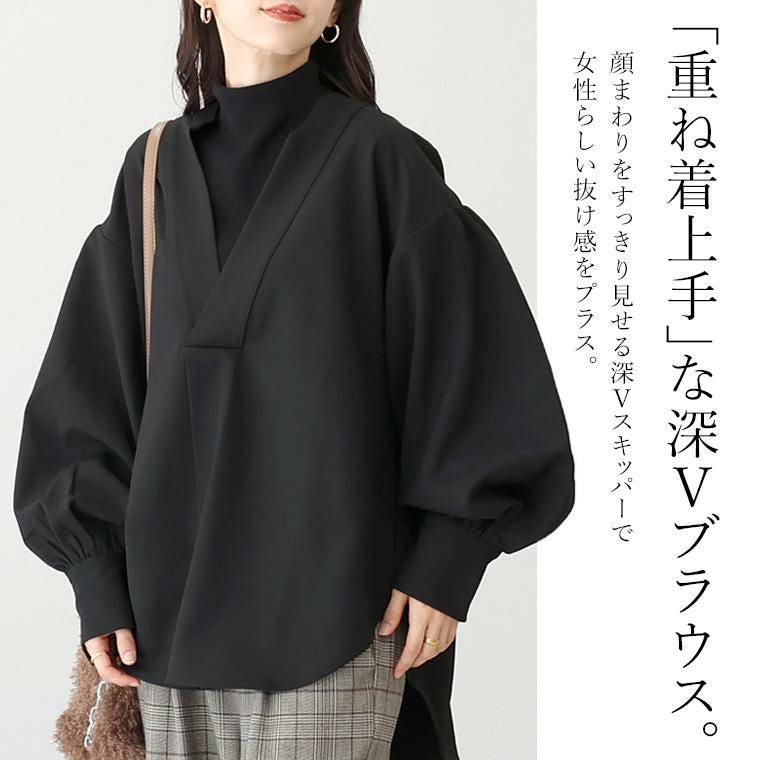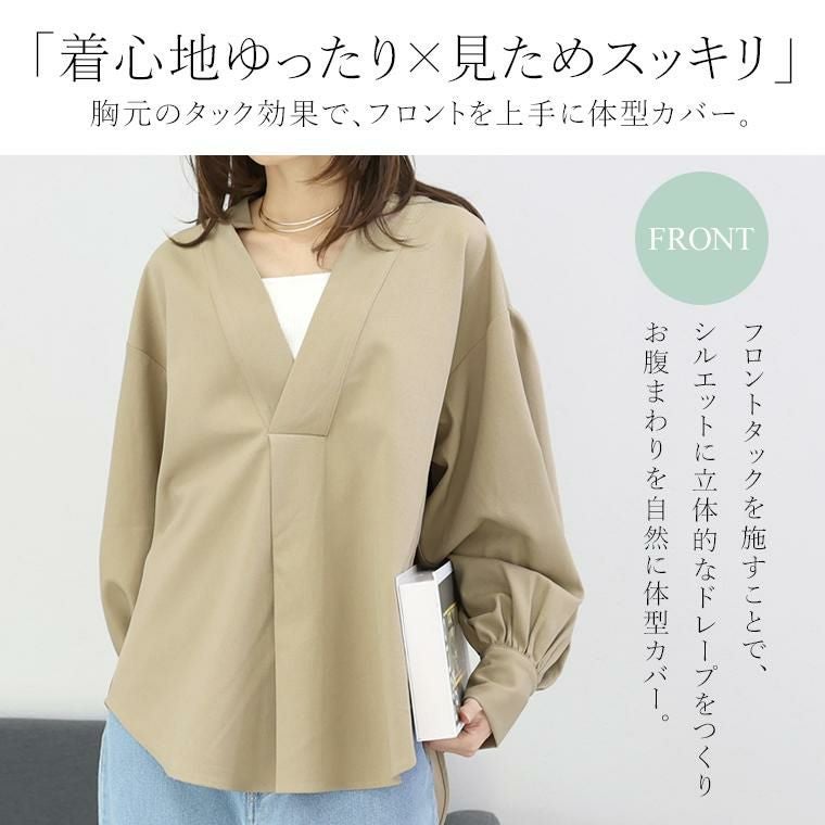 ハリのあるしっかりとしたツイル生地で仕立てたスキッパーブラウス。ほんのり光沢があり、上品な雰囲気を醸し出します。ざっくり深めのVネックで重ね着を楽しめるデザイン。顔まわりをすっきりと見せて小顔効果も期待できます。フロントの大胆なタックでお腹まわりのシルエットを自然に体型カバー。ギャザー付きのボリューム袖がフェミニンなシルエットをつくります。ヒップが隠れる長め着丈には、緩やかな曲線と加えて軽やかなシルエットに。オンオフで活躍する一枚で着映えるブラウスです。
