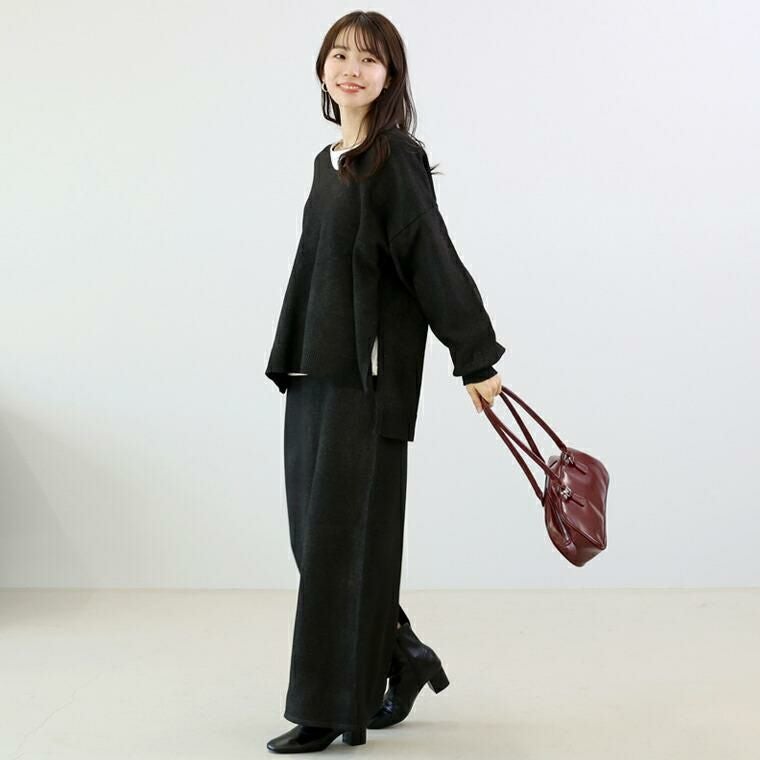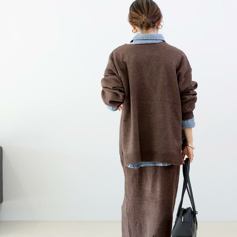 シンプルながら大人バランスが完成する万能ニット。7G天竺編みのほどよい厚みで体型を上手にカバーしつつ、重く見えず使いやすい。無地ながら表情豊かな杢調のカラーで単調にみせません。シルエットはドロップショルダー×ワイドな身幅のゆったりとした着心地で自然に華奢見え。一枚ではもちろん、シャツやカットソーを重ねたスタイルも楽しめます。サイドスリットと前後差のある着丈で、ボトムに重ねるだけでサマ見え。同素材のスカートと合わせれば、統一感のある上品なセットアップにもなります。ミニマルなデザインで長く愛用できる一着。