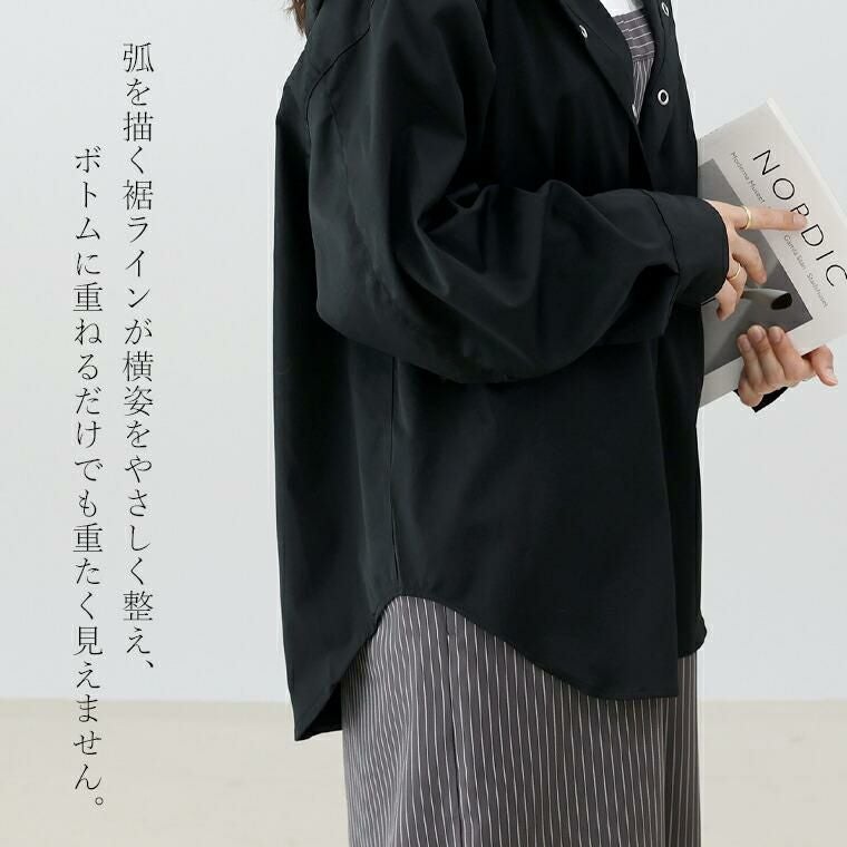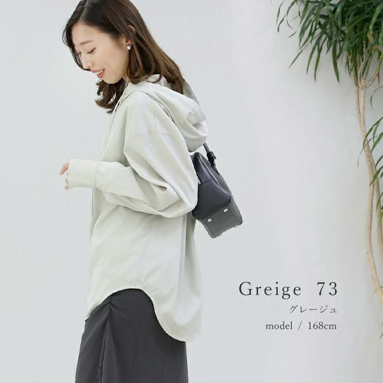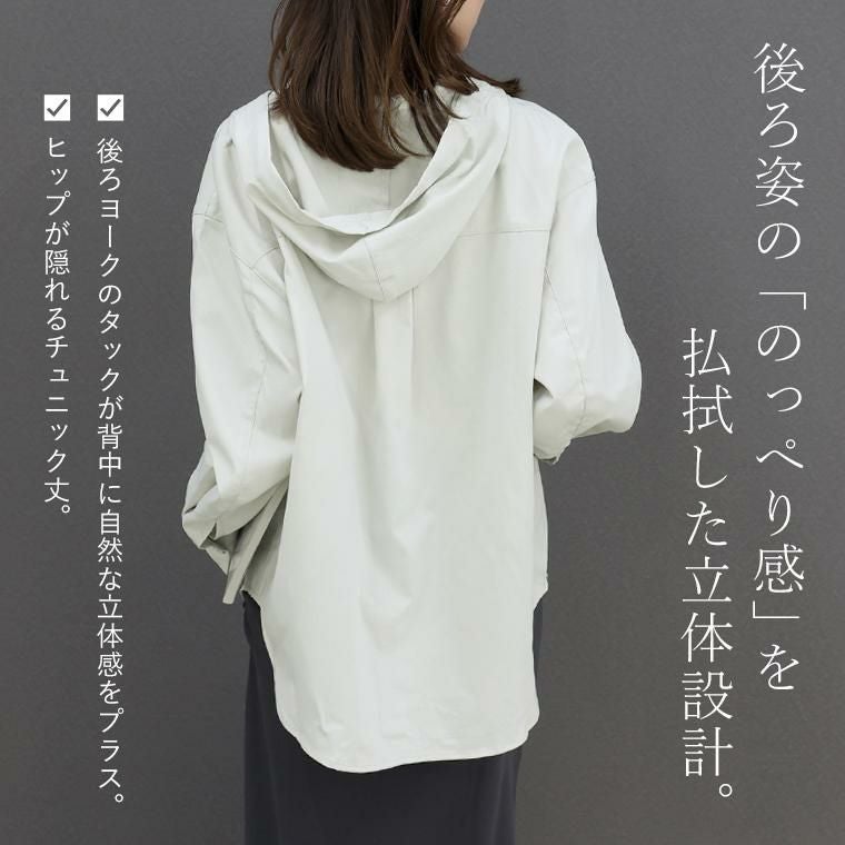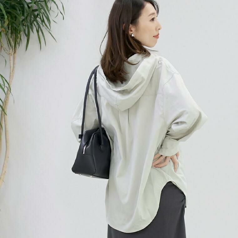 ポリエステルビンテージのシャツ生地仕立てのフード付きシャツ。カジュアルでもラフすぎず、一枚でも、羽織りとしても使えます。 共布のフード紐が大人らしい印象。ヒップが隠れるチュニック丈の裾はラウンドヘムになっており、重たく見えません。 後ろ姿はヨーク切替×タックをあしらい、背中に自然な立体感をプラスしたのっぺりしない設計。体型も、着こなしも、さりげなく整えてくれる大人シャツです。