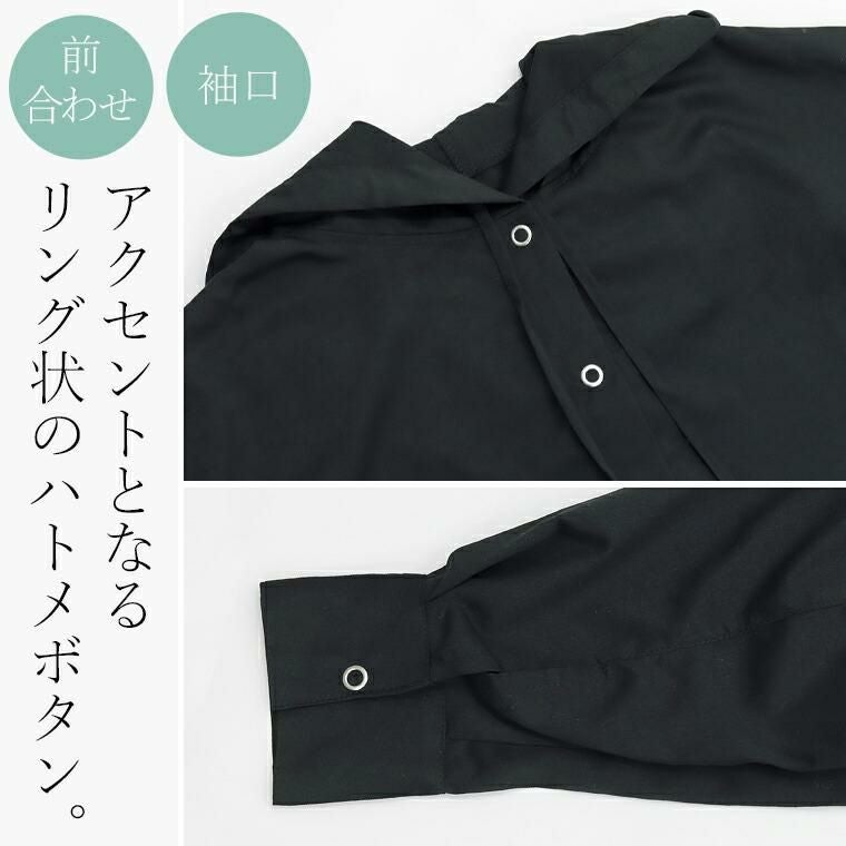 着丈はヒップから8cm下。袖丈は手首から14cm下。さらっとしていて軽い着心地です。着丈袖丈は長めです。伸縮性はありませんがゆったり着れます。ボタンを上まで留めても窮屈感はありません。