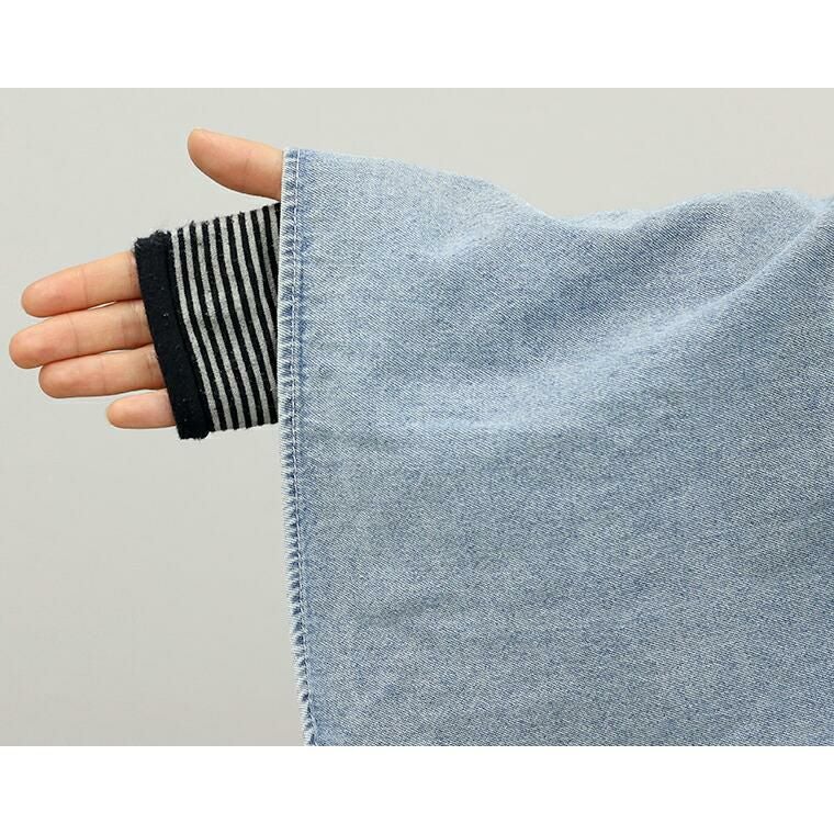 着丈はヒップから11cm下。袖丈は手首から16cm下。デニムの生地ですが生地が柔らかく着やすいです。ゆったりしているので中に薄手のニットなら着られそうです。ヒップをすっぽり隠してくれ◎。