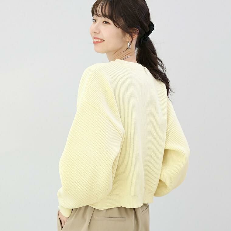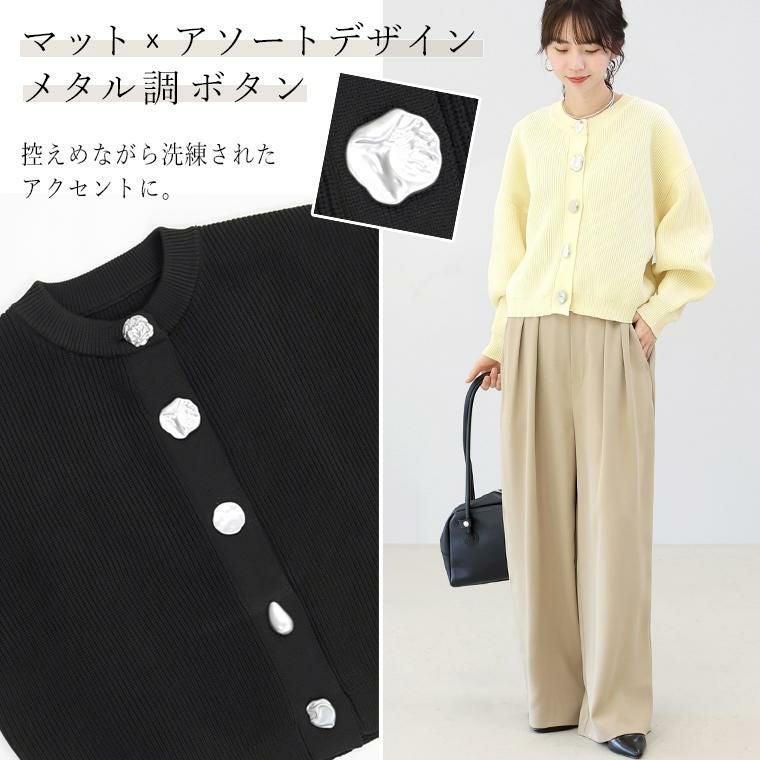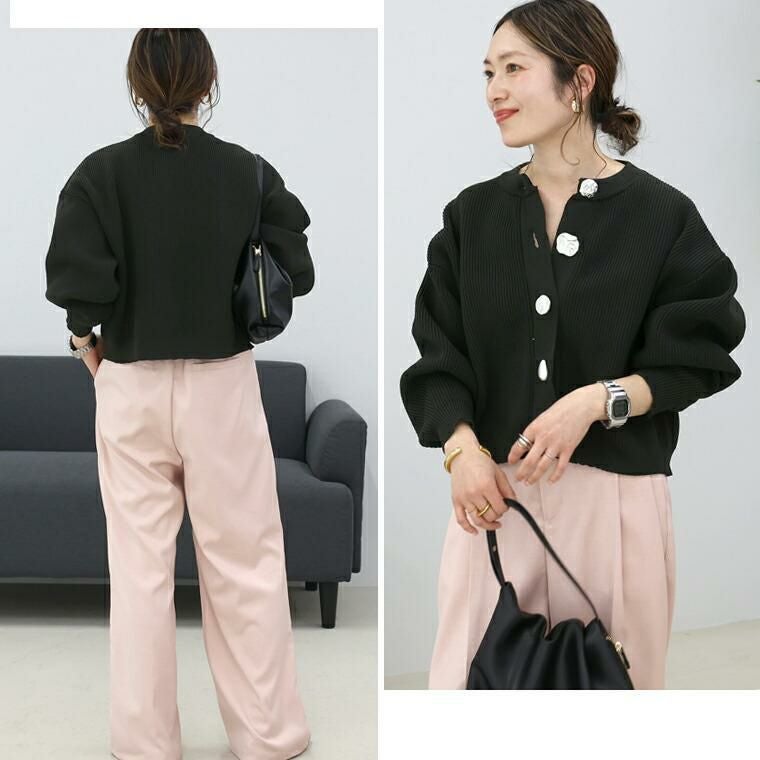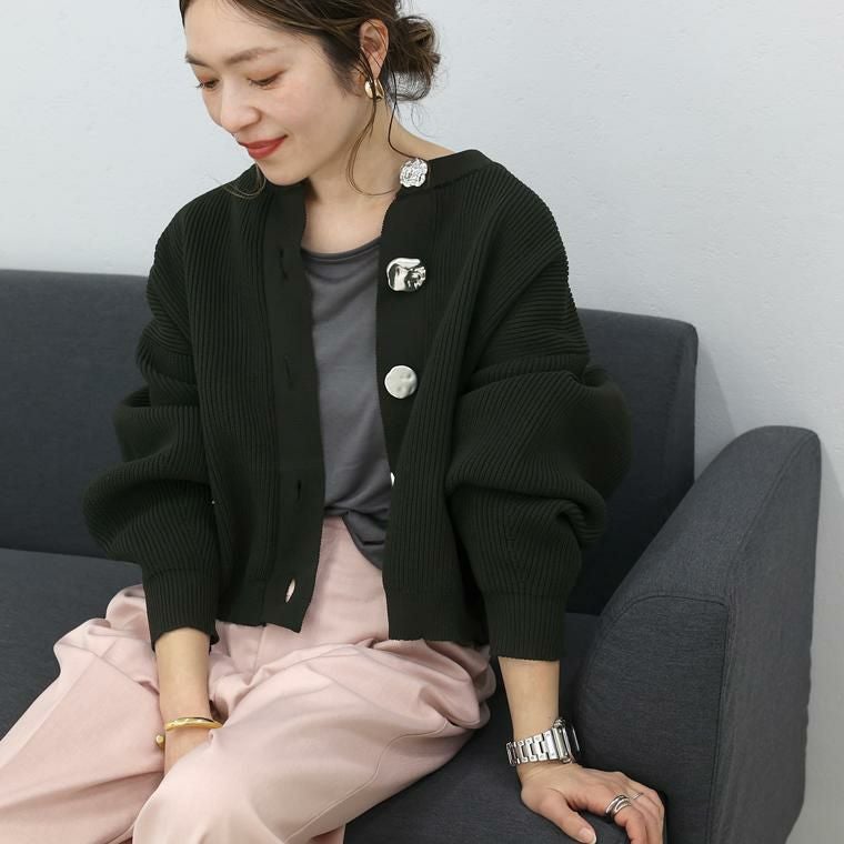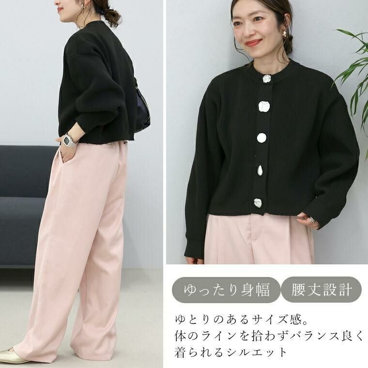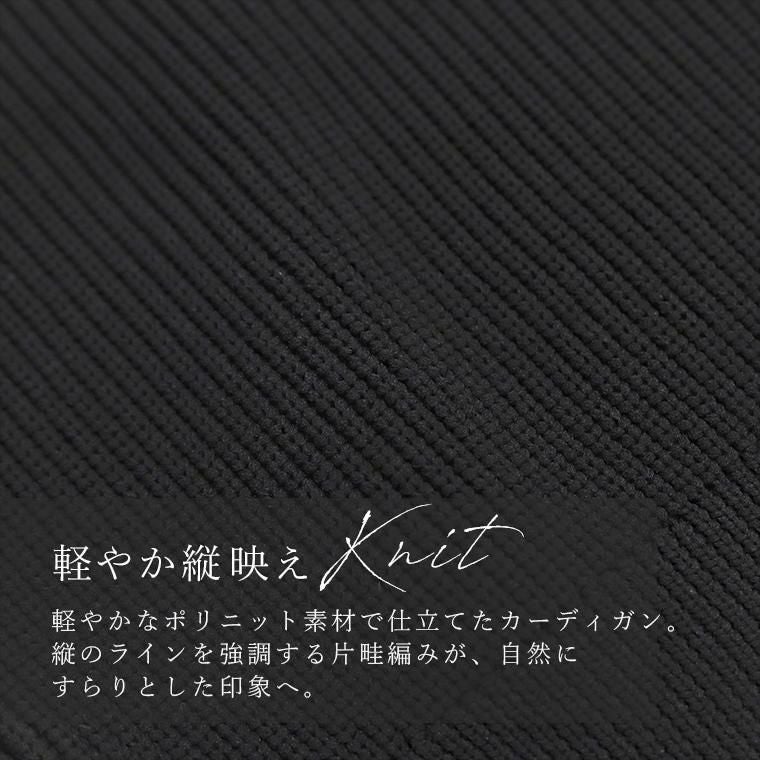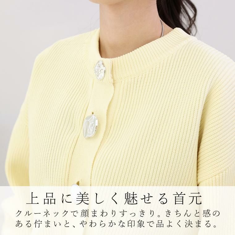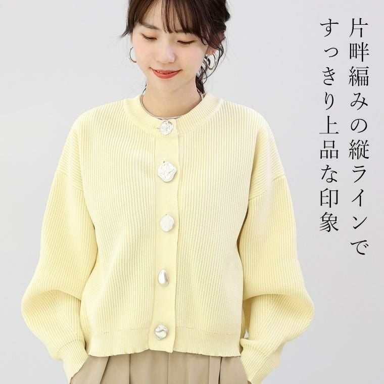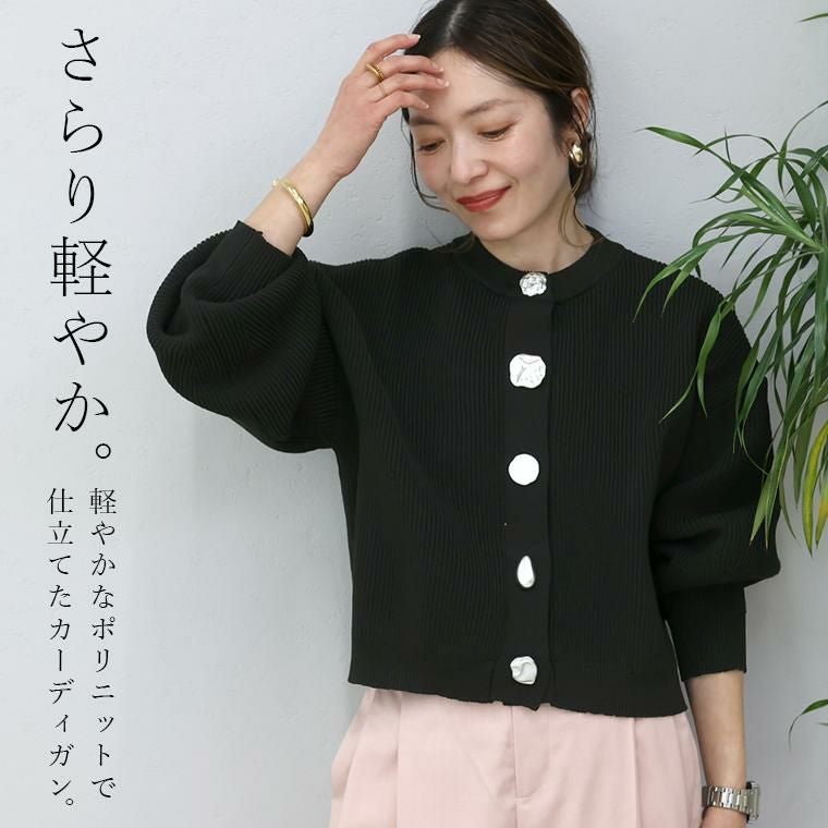 縦ラインを強調する片畦編みが、自然とすっきり見えを叶えるニットカーディガン。さらりとしたポリニット素材を使用し、軽やかな着心地でロングシーズン快適に着用できます。ゆとりのある身幅と腰丈のバランス設計で、体型を拾いにくく、羽織るだけでこなれた印象に。袖口に向かって窄まるポワン袖が、女性らしい立体感を演出します。クルーネックで顔まわりはすっきりと、きちんと感のある佇まいに。マットなアソートデザインのメタル調ボタンが、控えめながら洗練されたアクセントを添え、前を留めても開けてもサマになる一枚です。パンツにもスカートにも合わせやすく、デイリーからきれいめまで幅広く活躍します。