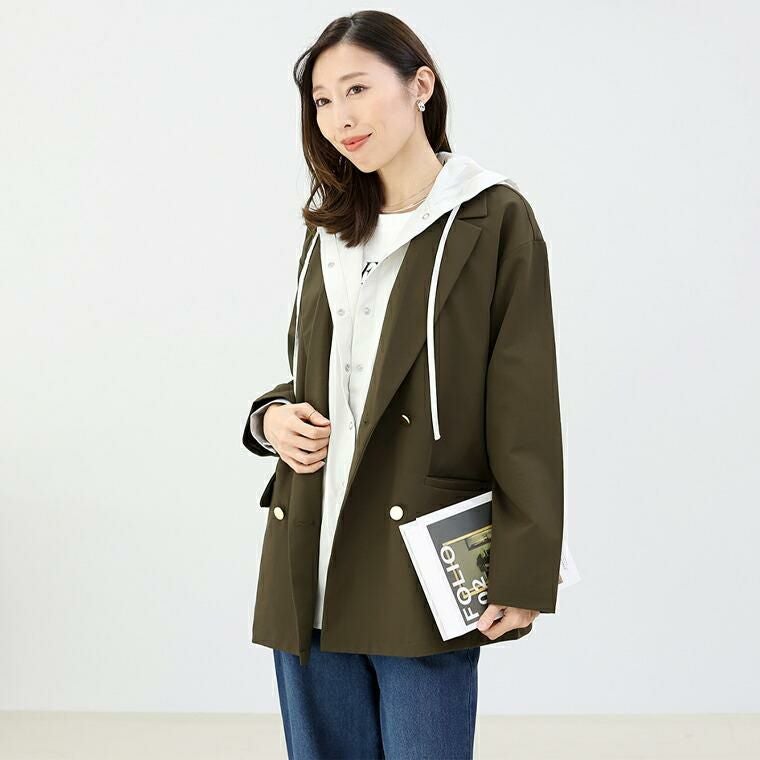 ほどよい落ち感のポリレーヨンクロスで仕立てたダブルジャケット。マットなゴールドボタンが品のあるアクセントになり、羽織るだけで装いが整います。ポリレーヨンクロスを使用し、ほどよいハリと落ち感を両立。きちんと見えしながら、重さを感じにくい着心地。ダブルブレスト仕様で、カジュアルなコーディネートに羽織るだけで引き締まります。オーバーサイズシルエットが体型を選ばず、こなれた印象に。マットなゴールドボタンが主張しすぎず、上品なアクセント。内側ボタンは同色仕上げで、細部まで落ち着いた印象。ノッチドラペルで、オンオフ問わず合わせやすい定番デザイン。フラップポケット付きで、きちんと感と実用性を両立。滑りの良い裏地付きで、重ね着しても袖通しなめらか。カジュアルに羽織れば抜け感、きれいめに合わせれば信頼感のある装いに。カジュアルにもきちんとしたシーンにも対応してくれます。