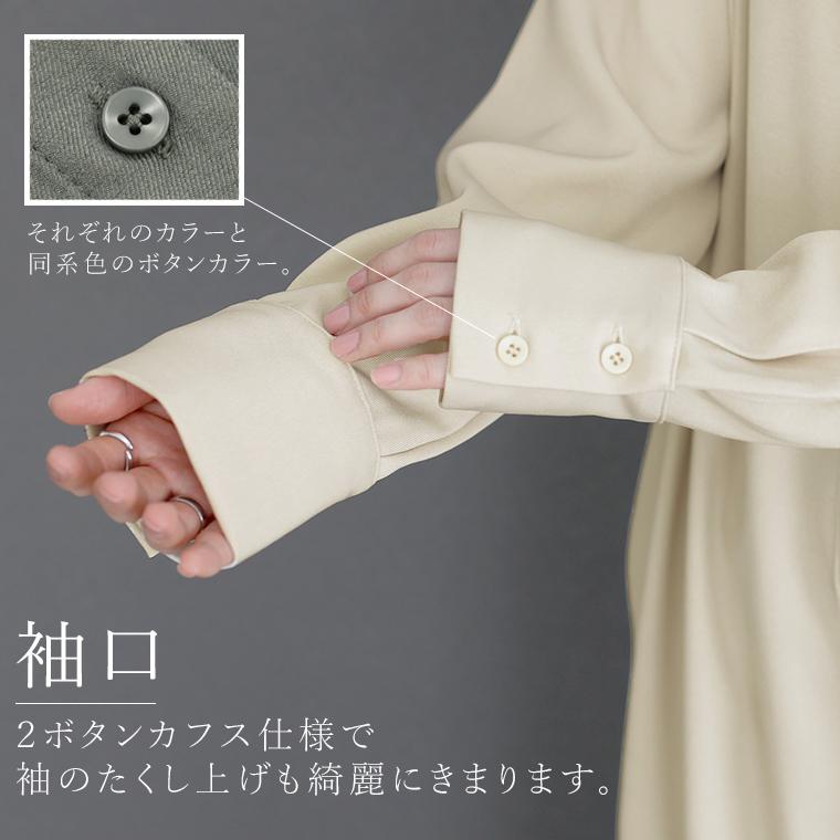 着丈はかかとが隠れるくらい。袖丈は手首から12cm下。生地に伸縮性はありませんが全体的にゆったりしているので体のラインを拾わず着れます。ボタンは一番上まで留めてもゆとりがあり窮屈さはありません。着丈が長めなので身長が高めの方におすすめです。