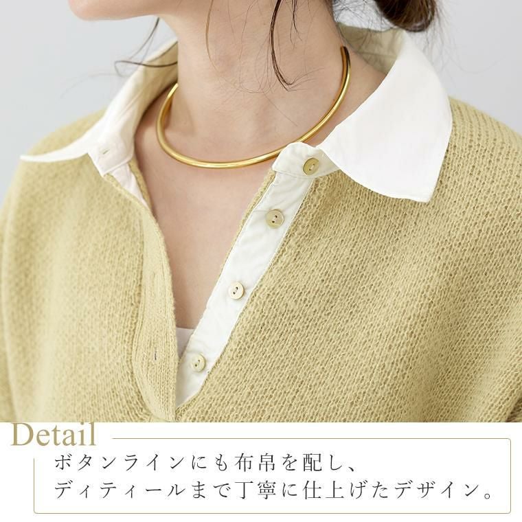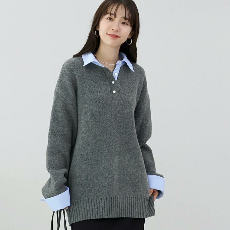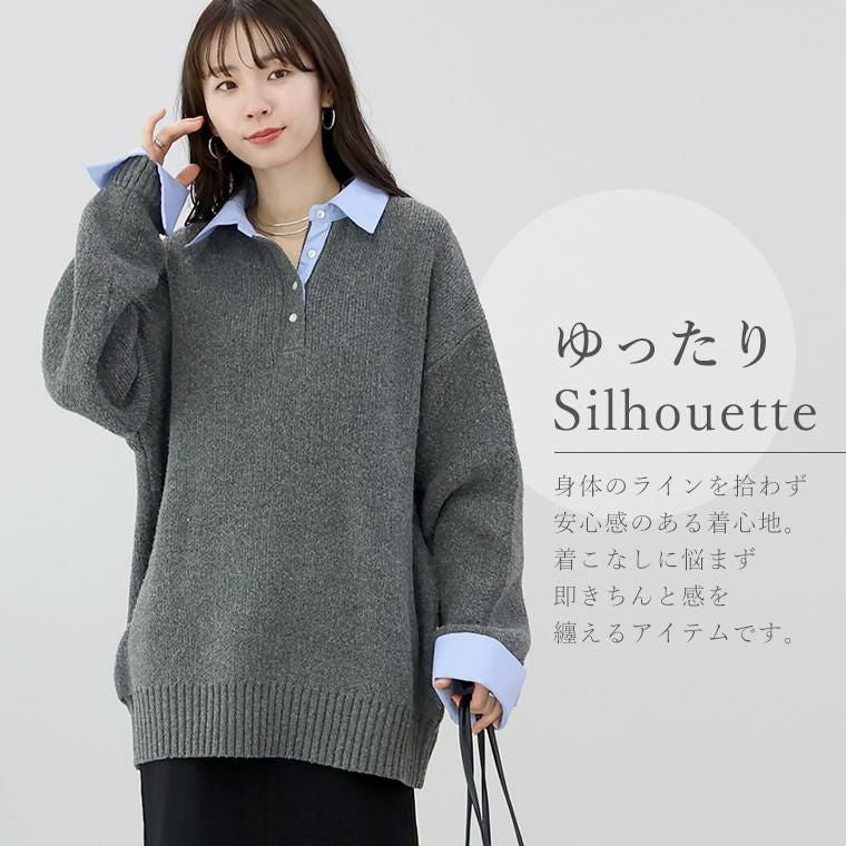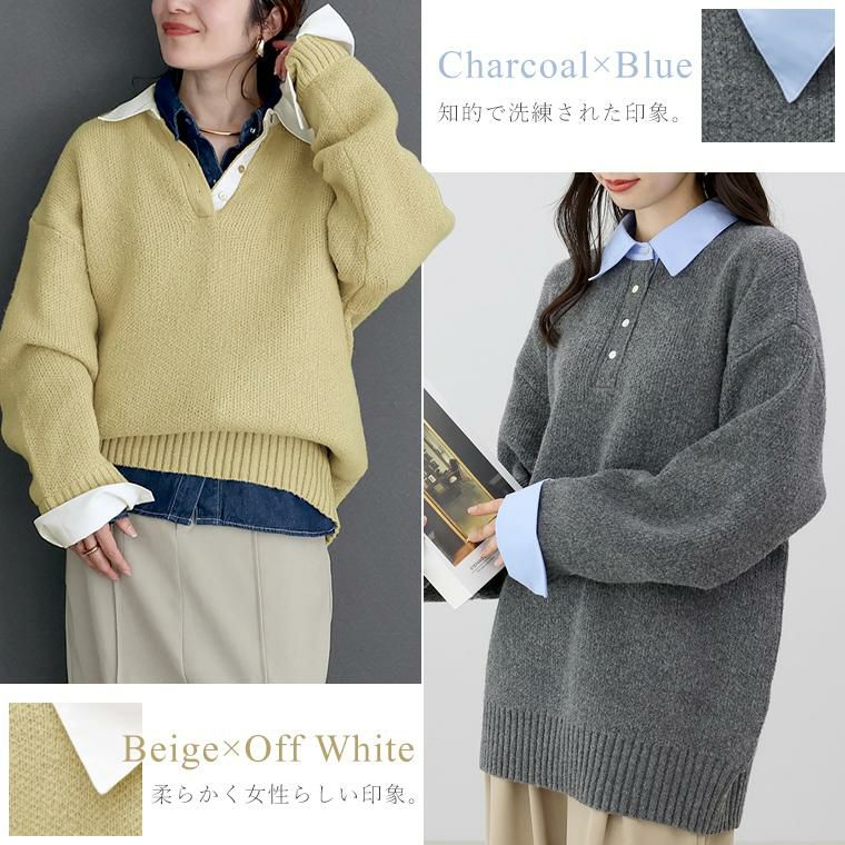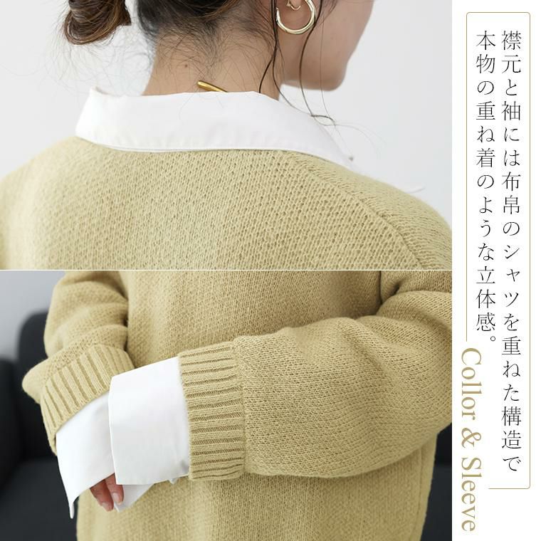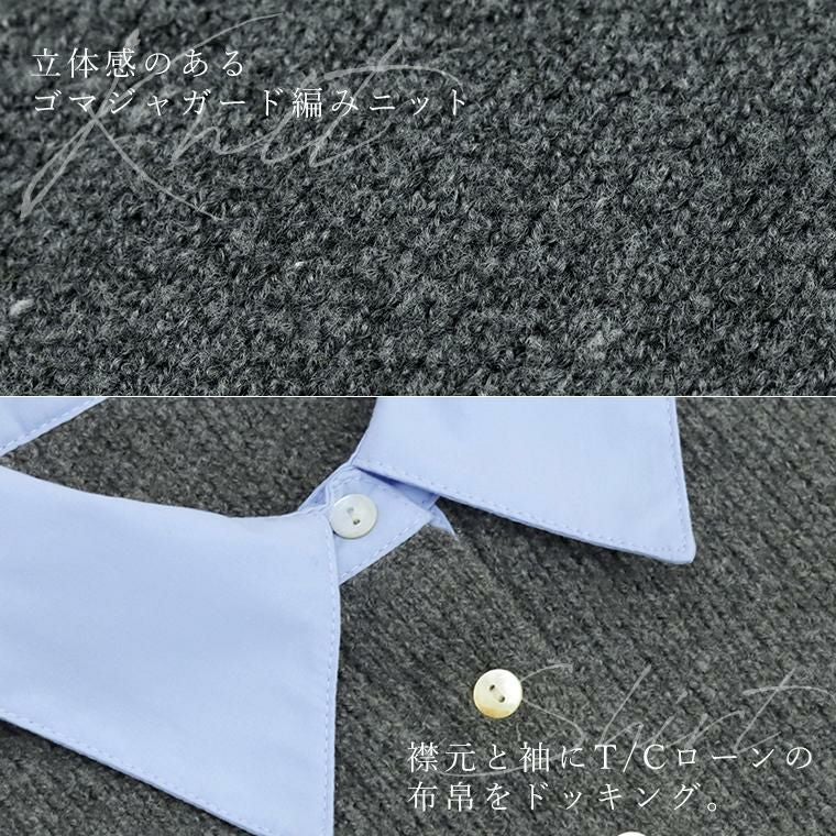 重ね着いらずで、きちんと洒落見え、一枚で完成する大人のレイヤードニット。立体感のあるゴマジャガード編みニットに襟元と袖にT/Cローンの布帛をドッキングし、シャツを重ねたようなデザイン。本格的なレイヤードスタイルが1枚で完成。襟・身頃はクリーンな配色で、大人の装いに馴染む上品な印象。ベージュ×オフホワイトはやわらかく女性らしく、チャコール×ブルーは知的で洗練された印象に。ゆったりとしたシルエットで、身体のラインを拾わず安心感のある着心地。長めの着丈が、腰まわりやヒップラインを自然にカバー。襟元には貝ボタンを採用し、さりげない高級感をプラス。ボタンラインにも布帛を配し、ディテールまで丁寧に仕上げたデザイン。袖はニットにシャツ袖を重ねた構造で、本物の重ね着のような立体感。ワイドスリーブのゆとりある着用感に袖口のスリットで抜け感と女性らしい軽やかさを演出。着こなしに悩まず即きちんと感をまとえるアイテムです。