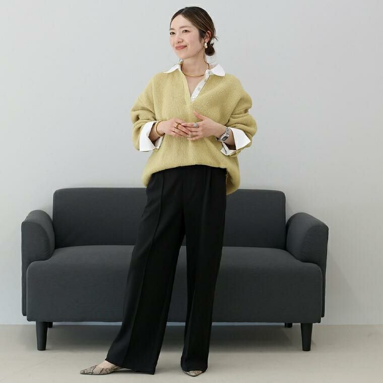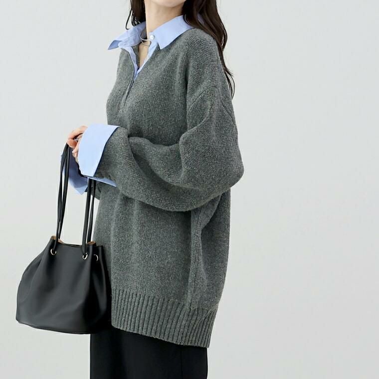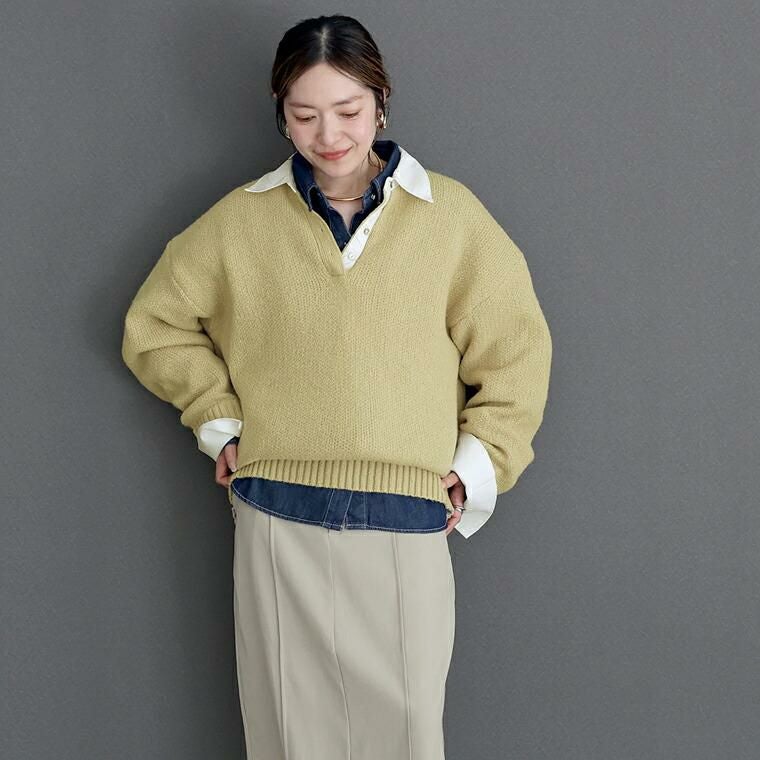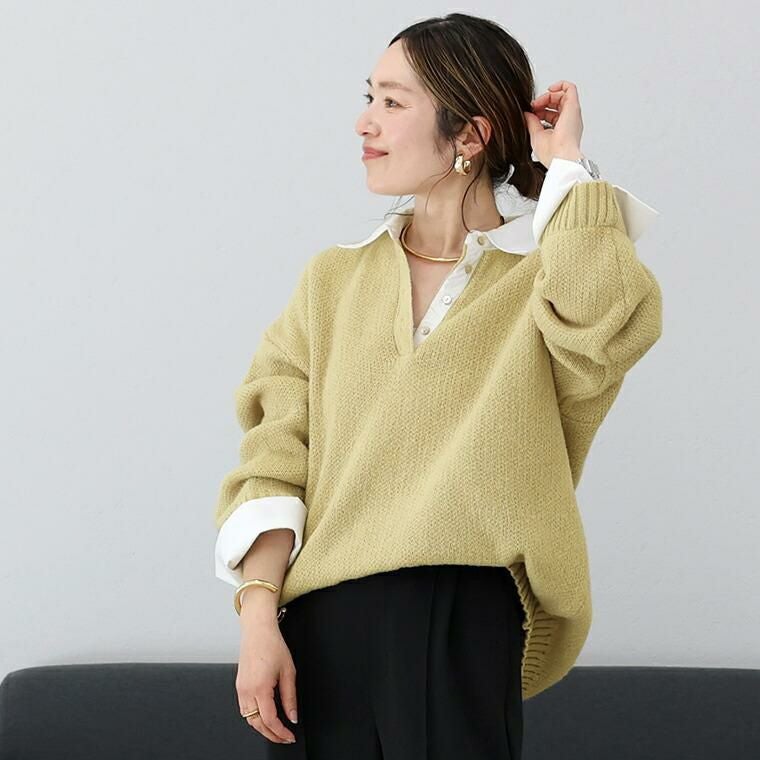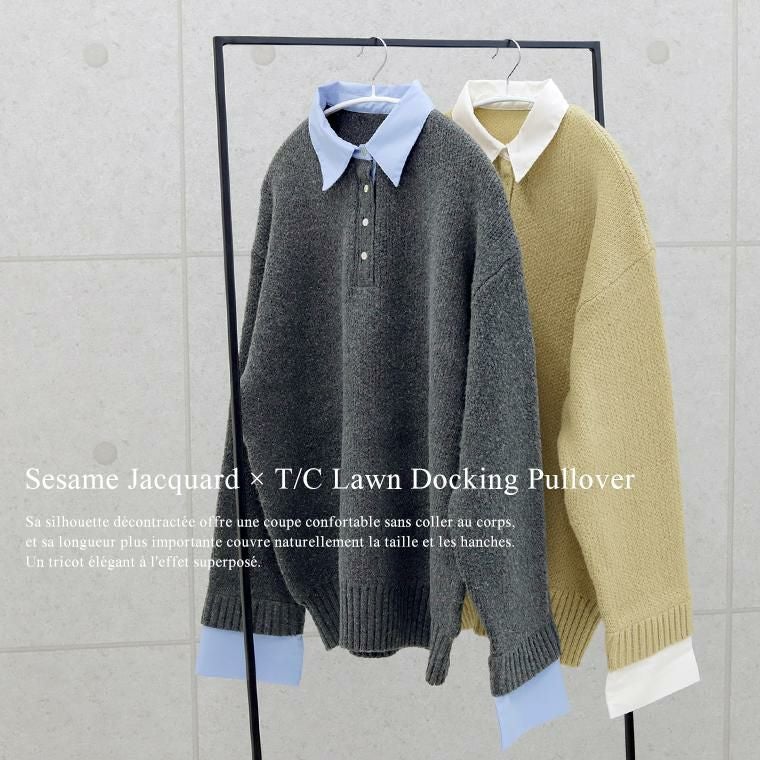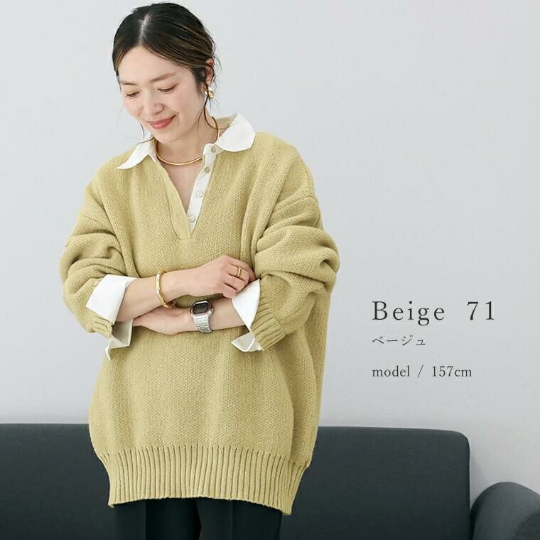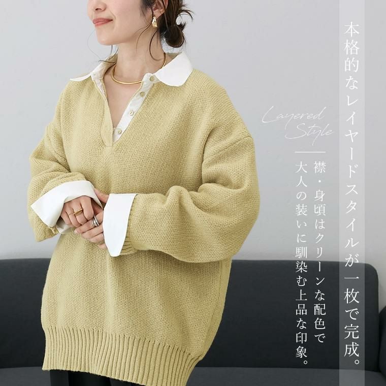 重ね着いらずで、きちんと洒落見え、一枚で完成する大人のレイヤードニット。立体感のあるゴマジャガード編みニットに襟元と袖にT/Cローンの布帛をドッキングし、シャツを重ねたようなデザイン。本格的なレイヤードスタイルが1枚で完成。襟・身頃はクリーンな配色で、大人の装いに馴染む上品な印象。ベージュ×オフホワイトはやわらかく女性らしく、チャコール×ブルーは知的で洗練された印象に。ゆったりとしたシルエットで、身体のラインを拾わず安心感のある着心地。長めの着丈が、腰まわりやヒップラインを自然にカバー。襟元には貝ボタンを採用し、さりげない高級感をプラス。ボタンラインにも布帛を配し、ディテールまで丁寧に仕上げたデザイン。袖はニットにシャツ袖を重ねた構造で、本物の重ね着のような立体感。ワイドスリーブのゆとりある着用感に袖口のスリットで抜け感と女性らしい軽やかさを演出。着こなしに悩まず即きちんと感をまとえるアイテムです。