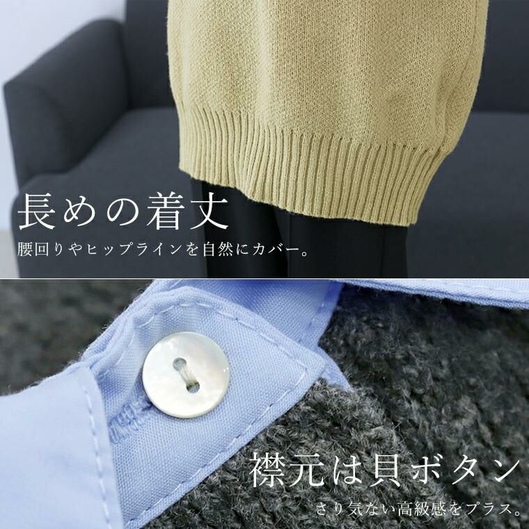 着丈はヒップが5cm下。袖丈は手首から22cm下。ゆったりした着心地で着やすいです。襟と袖が特徴的で1枚で着てもコーデがキマり◎。ニットで暖かいです。