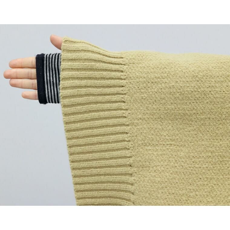 着丈はヒップが少し出るくらい。袖丈は手首から16cm下。全体的に大きめで中に厚手のインナーを重ねられます。袖丈が長めで手が隠れるほどの長さです。ゆったりしていて体のラインを隠してくれます。