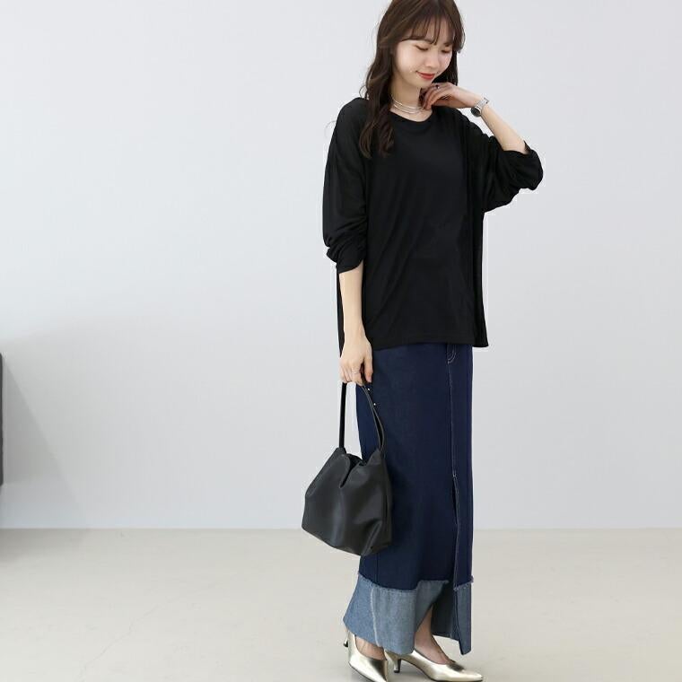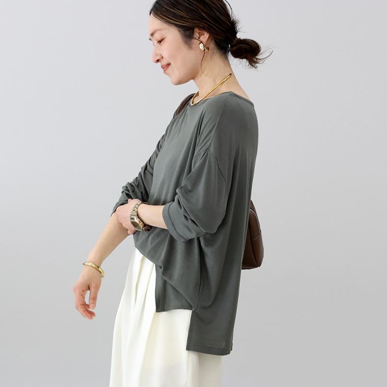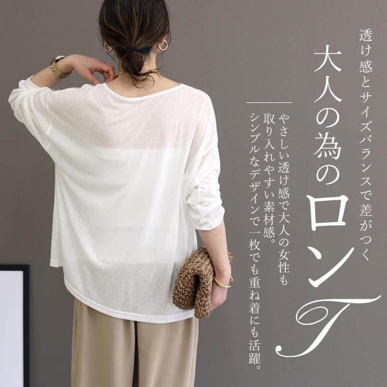 ベーシックなアイテムながら今年らしさと季節感、女性らしさを高めてくれる大人の為のロンT。部分的に繊維を溶かす加工を施したオパール生地で、軽やかな透け感が特徴。生地に奥行きがあるので、一枚でラフに着た時もきちんとサマになります。薄手でインナーとしてもごわつかず、ベストやジャケットの下にもおすすめです。やや大きめのサイジングで体のラインを拾わずゆったり。生地に落ち感があるので、ワイドな身幅も広がらずリラックス感ある雰囲気に仕上がります。インナー・レイヤード・一枚着と、幅広い着こなしで活躍する頼れるアイテムです。