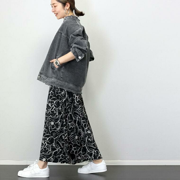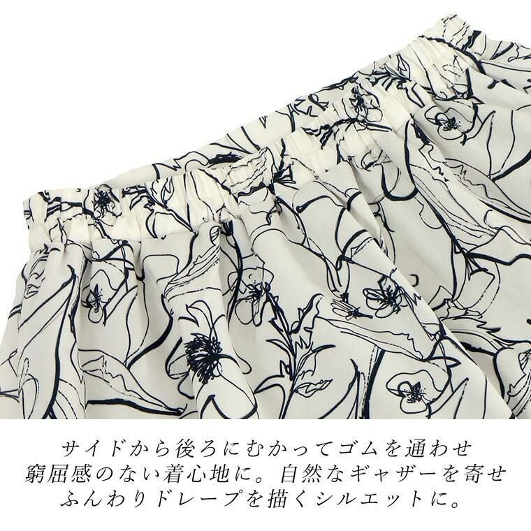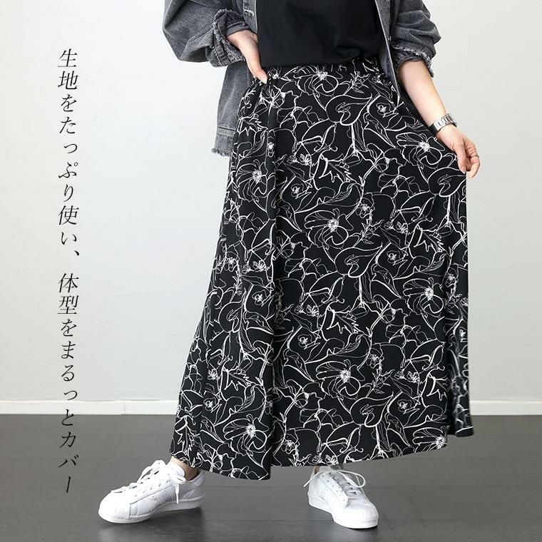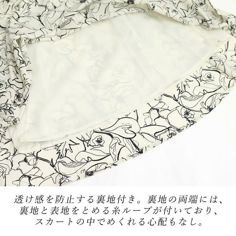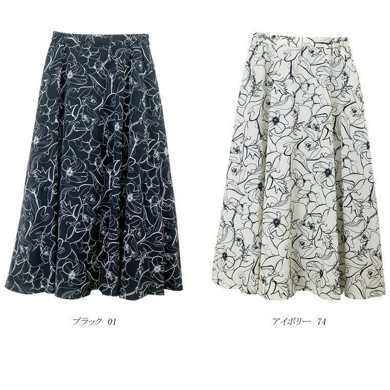 線描き花柄プリントフレアスカート 当店定番「ダルメシアンデシンフレアスカート」のシルエットに新柄が仲間入り。 ドラマチックな大人なムード漂う線描きフラワーの総柄スカートです。 モノトーンなのでコーデにも取り入れやすく、上品なスタイリングに。 柄もの初心者さんにもおすすめです。シルエットは人気の広がりすぎない フレアで、脚のラインをカバーしながらすっきり見えを意識。後ろウエストゴムの 自然に生み出すドレープ感で優美なシルエットを描きます。シーズンレスで 着られる生地で、季節に合わせた着こなしを楽しんでいただけます。