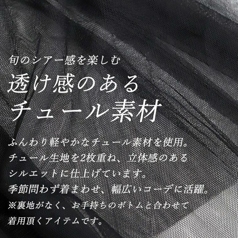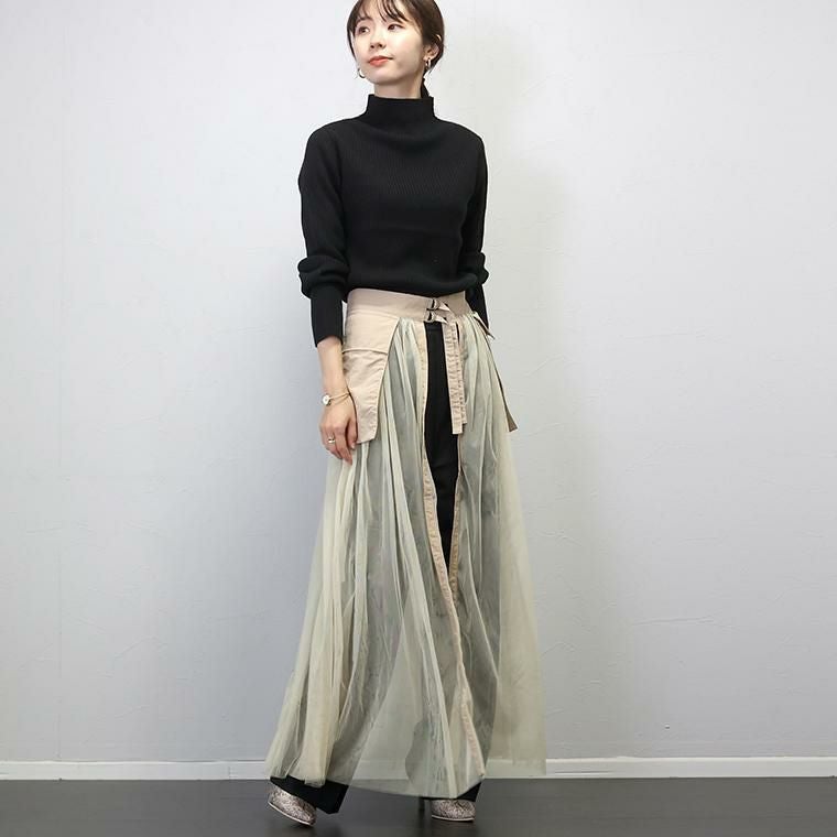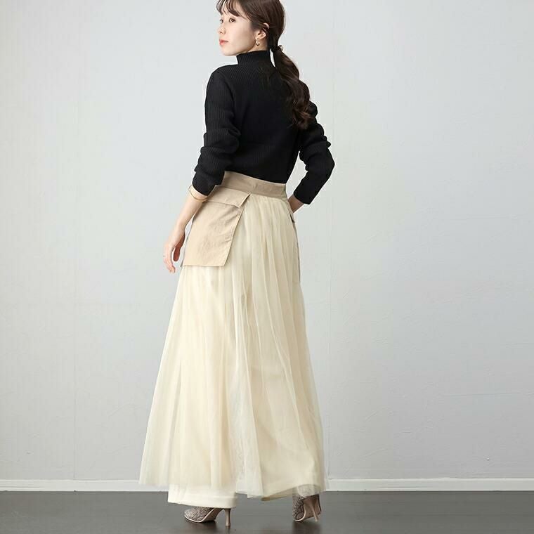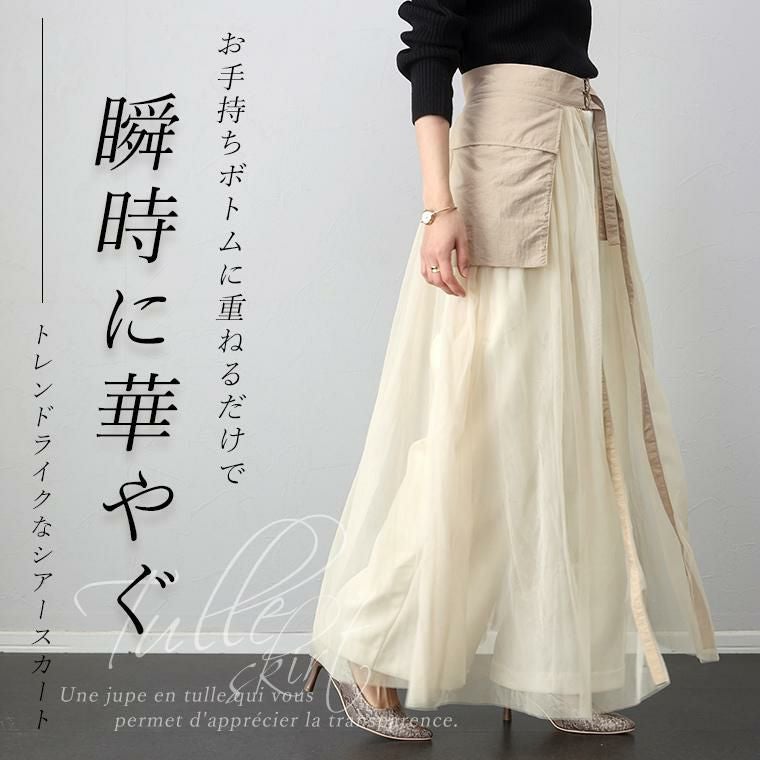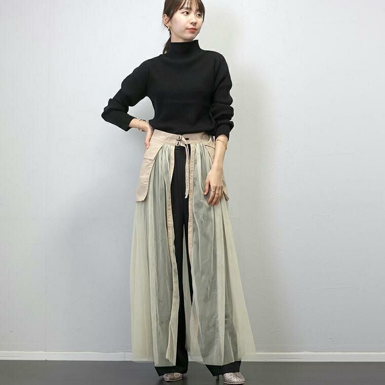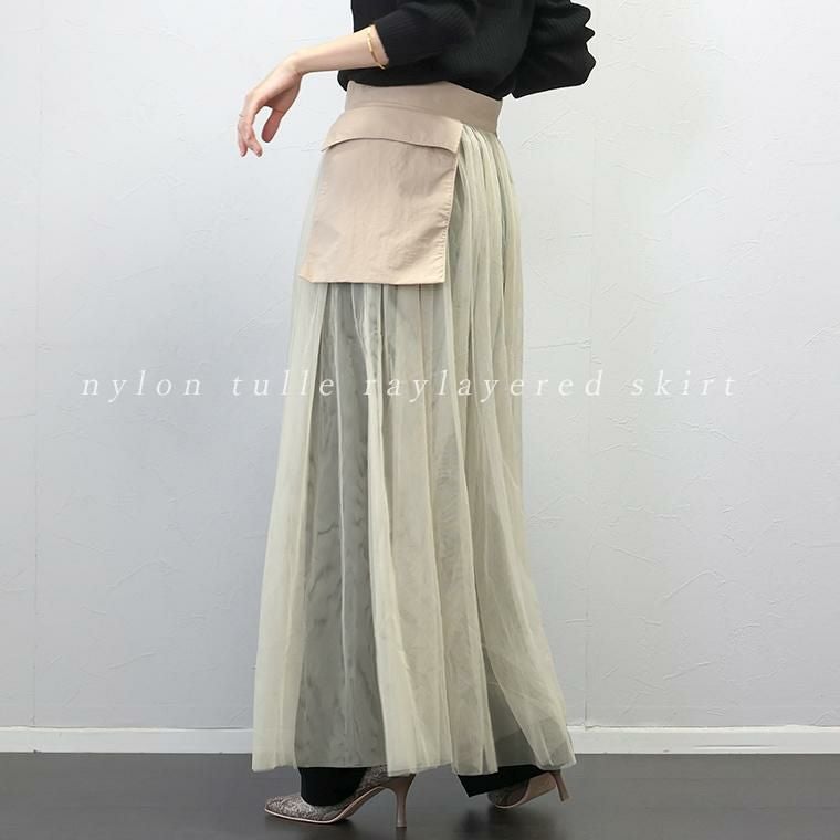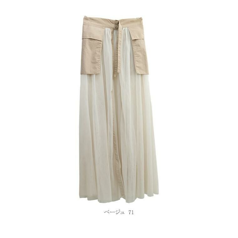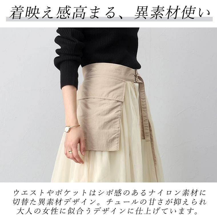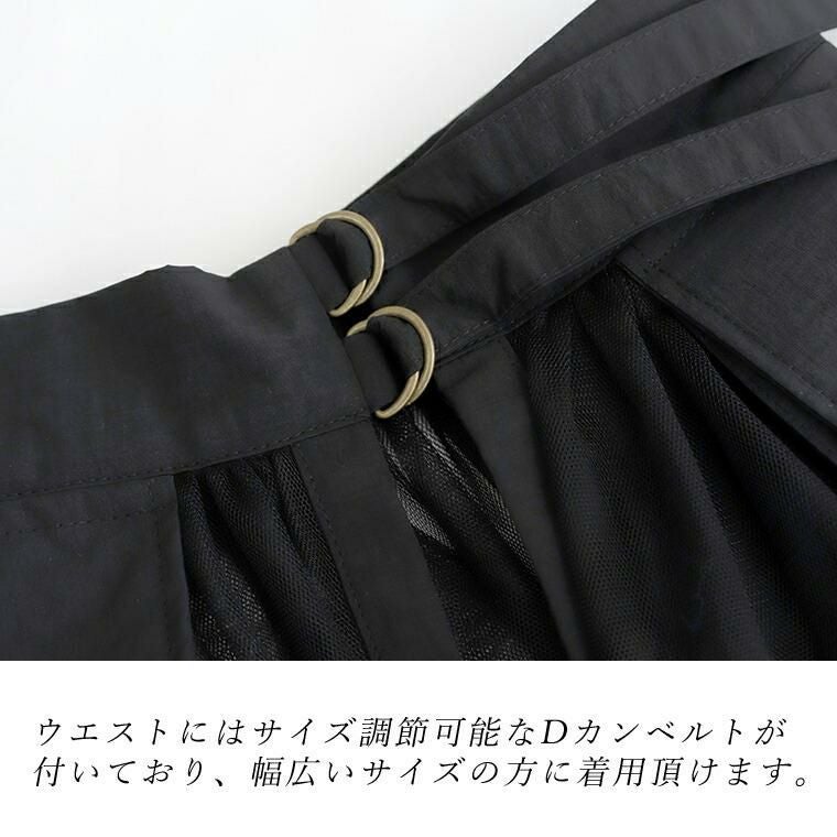 ナイロンxチュールレイヤードスカート お手持ちのパンツやスカートに合わせて、旬の重ね着を楽しめる レイヤードスカート。全体的に透け感のある軽やかなチュール生地 をたっぷりと使って、揺れ感のある女性らしいシルエットに仕上げ ました。甘くなり過ぎないよう、ウエスト部分とサイドのポケットは シボ感のあるナイロン生地に切り替えて、大人に似合うデザインに。 Dカンベルトとポケットがキリリとアクセントになっています。 シーズン問わず着まわせて、コーデの幅もぐんと広がる一枚です。