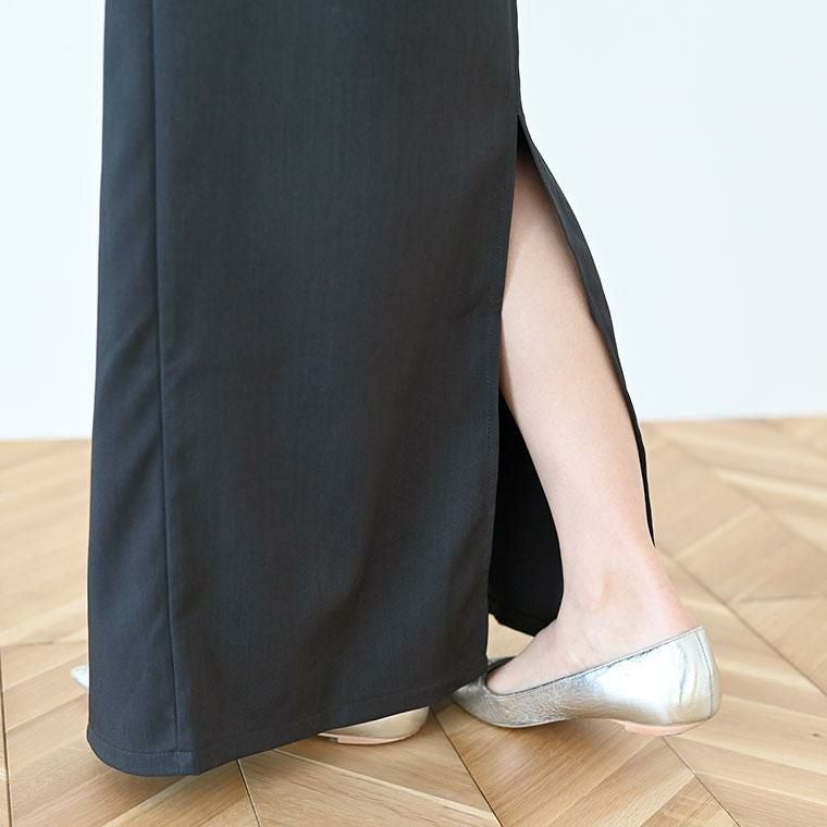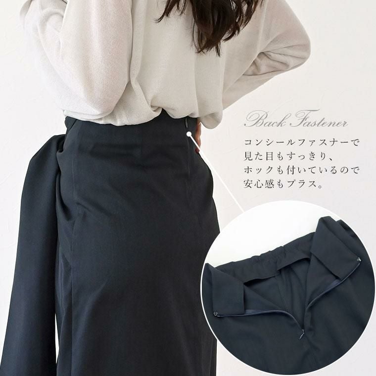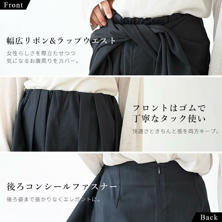 幅広リボンとラップウエストのウエストコンシャスなデザイン。女性らしさを際立たせつつ気になるお腹周りをカバー。ストンと落ちる洗練された美しいラインが、縦長効果を演出しスタイルアップ。ウエストはフロントゴムと丁寧なタック使いで快適さときちんと感を両方キープ。後ろのファスナーはコンシールファスナーで、後ろ姿まで抜かりなくエレガントに。ポリエステル×ポリウレタンの絶妙なハリ感が、高見えと快適さを両立。比較的シワになりにくい上質素材です。品良く馴染む杢無地のニュアンスカラーで、オンにもオフにも映える一着。軽やかで裏地無しでも快適な着心地。レイヤード次第でオールシーズン活躍します。