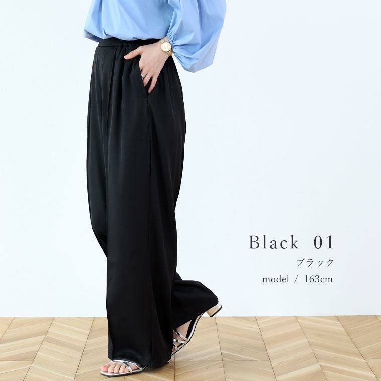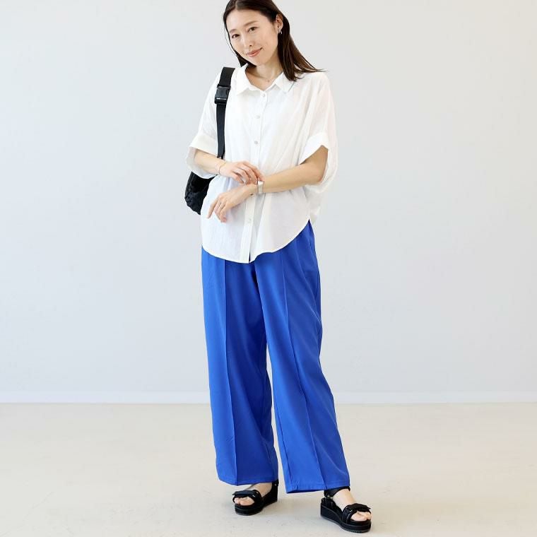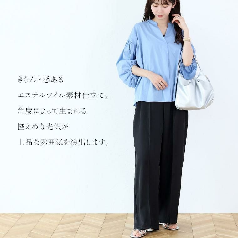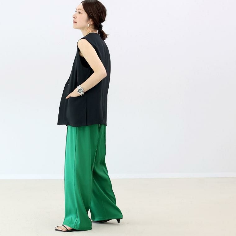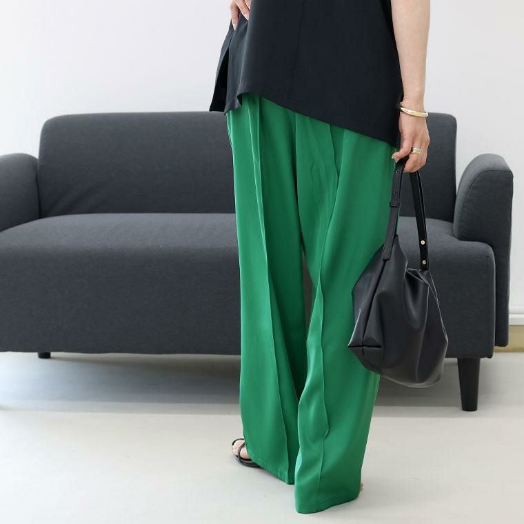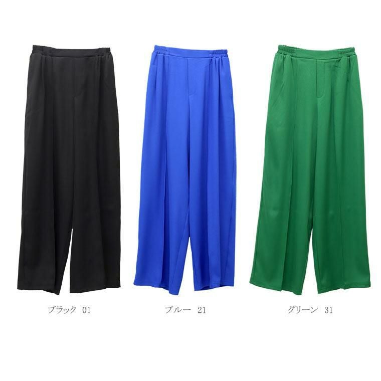 ベーシックでトレンド不問で穿けるワイドパンツ。基本のブラックと綺麗色のブルーとグリーンの色展開で着まわし力抜群です。きちんと感あるエステルツイル生地仕立てで、裏地なしでも透けにくく安心の着用感。ウエストゴム仕様なっており、すっぽり穿けて楽です。前後にはセンターシームが施され、すらり見えするシルエットをつくります。レッグラインを拾いにくいワイドなシルエットながらも落ち感があるから、キレイなシルエットで穿くことができます。