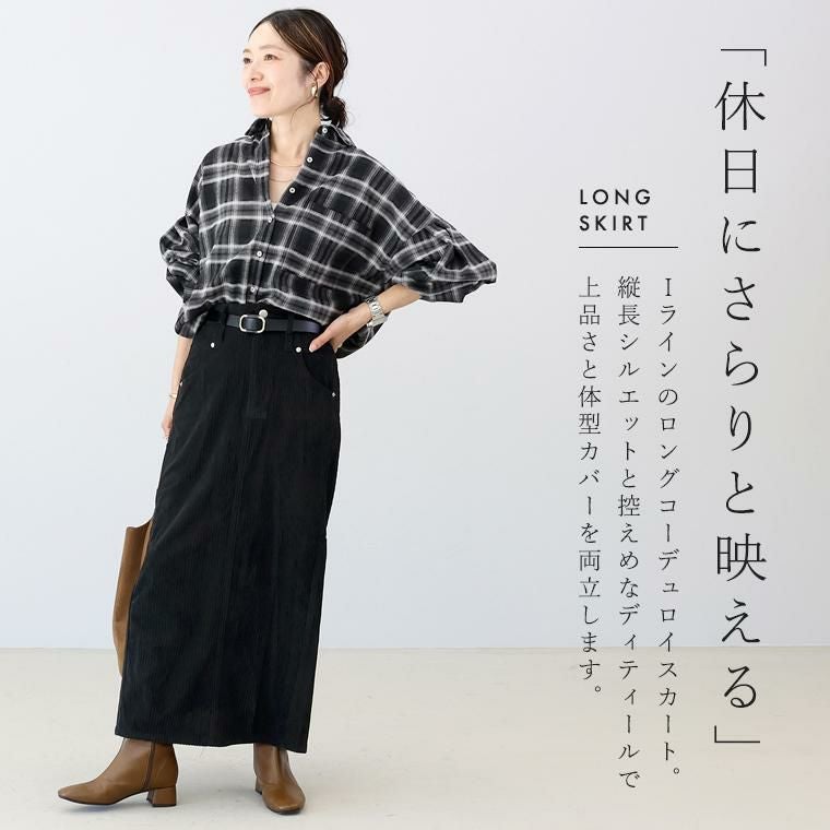 【休日にさらりと映える、Iラインのロングコーデュロイスカート】