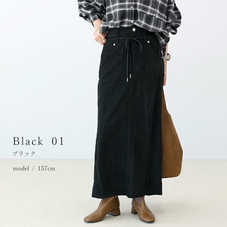 縦長シルエットと控えめなディテールで、上品さと体型カバーを両立します。太すぎない8Wコーデュロイ生地で大人カジュアルスタイルにぴったり。ロング丈×Iラインシルエットで縦長効果&体型カバー。ローウエストの同系色の飾り紐が着こなしのポイントに。便利なサイドポケット付きで後ろポケットでヒップラインをさりげなくカモフラージュ。マットなシルバーボタンがアクセント。ウエストはファスナー+ボタン仕様で着脱しやすい。センターバックスリットで歩きやすさと軽やかさをキープ。裏地がない軽い穿き心地でも透ける心配はありません。ニットやシャツ、プルオーバーと様々なアイテムと合わせやすく、ブーツやスニーカーで休日らしい抜け感が演出可能な1枚です。