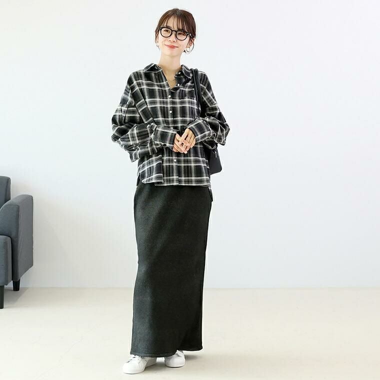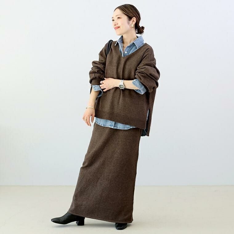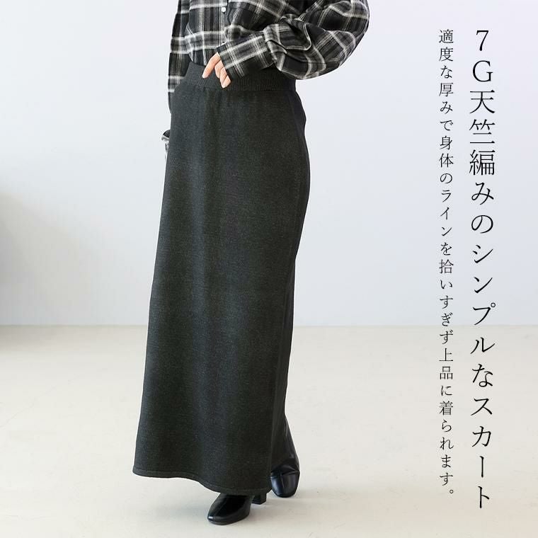 7G天竺編みのシンプルなスカート。適度な厚みで、身体のラインを拾いすぎず上品に着られます。Iラインのシルエットが縦のラインを強調し、脚がまっすぐ見える美バランスに。メランジ糸ならではの奥行きある表情で、シンプルでも洗練された印象です。ウエストは全周ゴムで楽なのに、ウエスト周りをすっきり見せる設計。後ろ裾のスリットが脚さばきを良くし、女性らしい抜け感もプラス。伸縮性抜群のニットで、長時間の着用でも快適でストレスフリー。ミニマルなデザインだからトップスを選ばず、オンにもオフにも使いやすいのが嬉しい。同素材のトップスと合わせれば、統一感のある大人のセットアップスタイルが完成。シンプルな中に上質さが宿り、手持ちのアイテムとも自然に調和する1枚です。