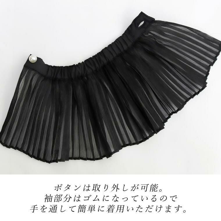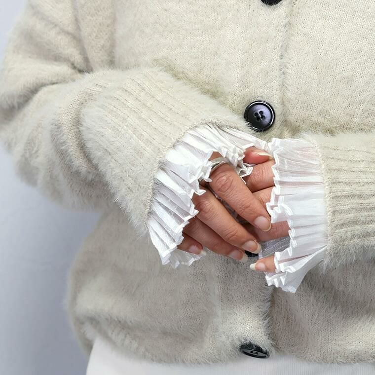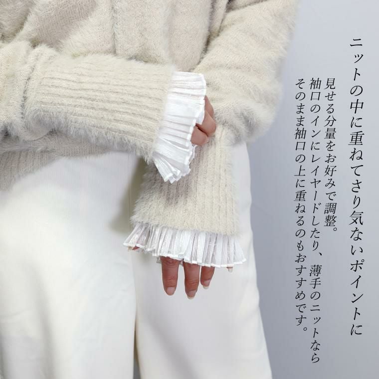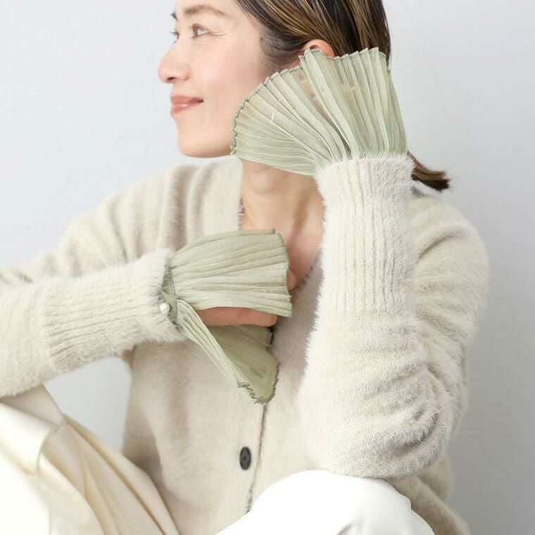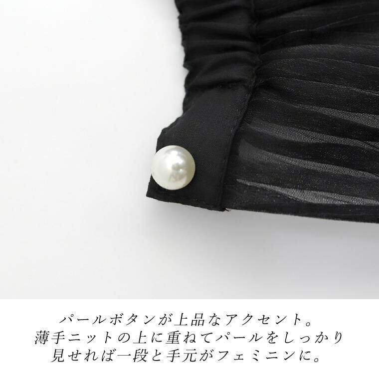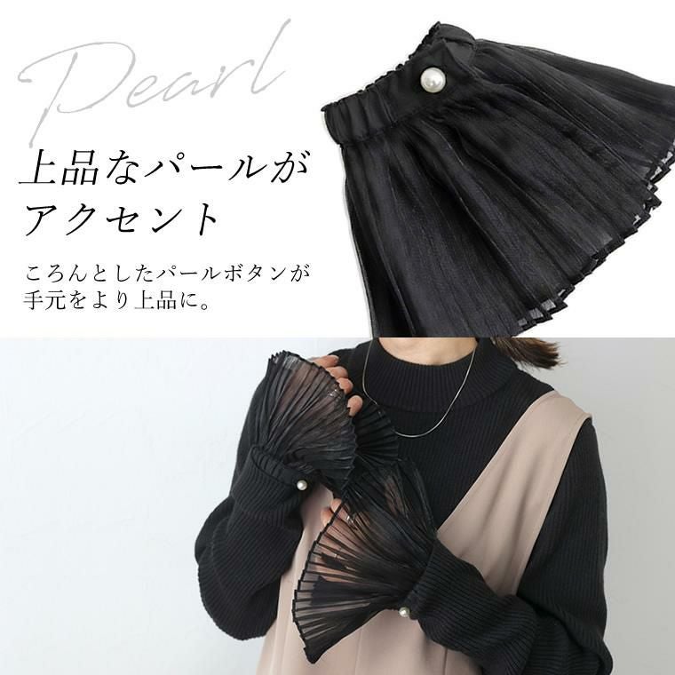 シアーシャイニープリーツカフス いつものコーディネートにプラスするだけで、ぐっと旬に華やぐ シアープリーツの付け袖。ニット等トップスの袖口に重ねるだけで 女性らしさがアップデート。シンプルなコーデを素敵にカスタマイズしてくれる アイテムです。袖口はゴムになっており、着用もとても簡単。アクセントにも なっている上品なパールはボタンで、ボタン開閉も可能です。角度によって 繊細に輝くシャイニーな素材感で着こなしに差を付けます。重たくなりがちな 冬のスタイルを軽やかに華やいでくれる、プラスワンアイテムです。