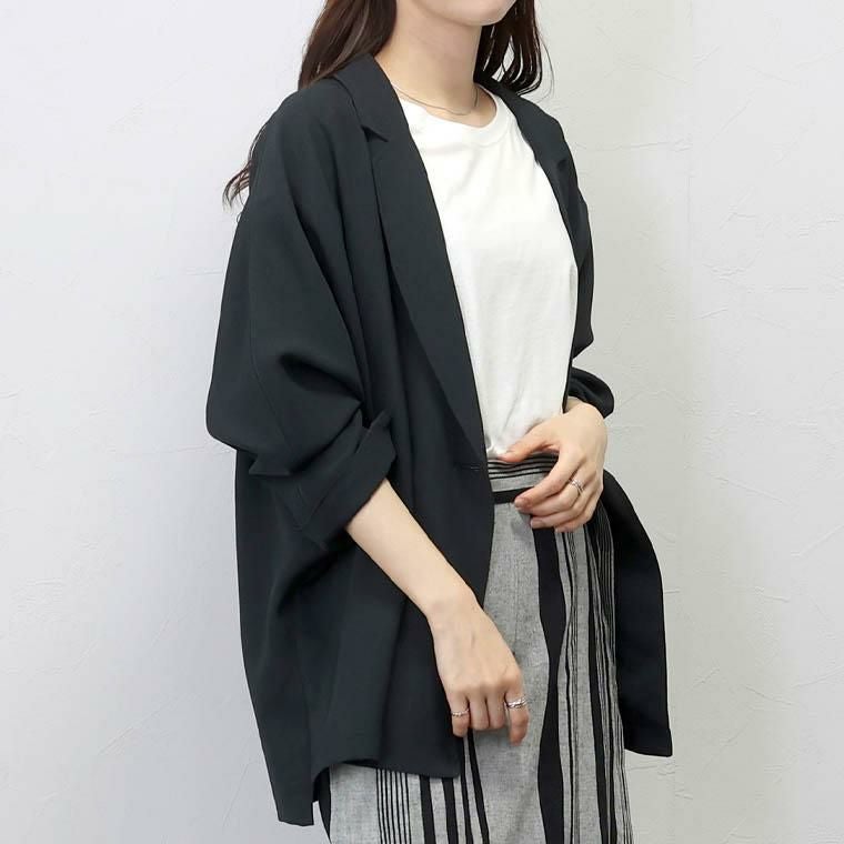 着丈はヒップが半分隠れるくらい。袖丈は肩から7cm下。肩幅広めの私でもキツさはないですが、若干肩幅が広く見える気がします。袖口から少し中が見えてしまうので、一枚で着る時は注意が必要です。