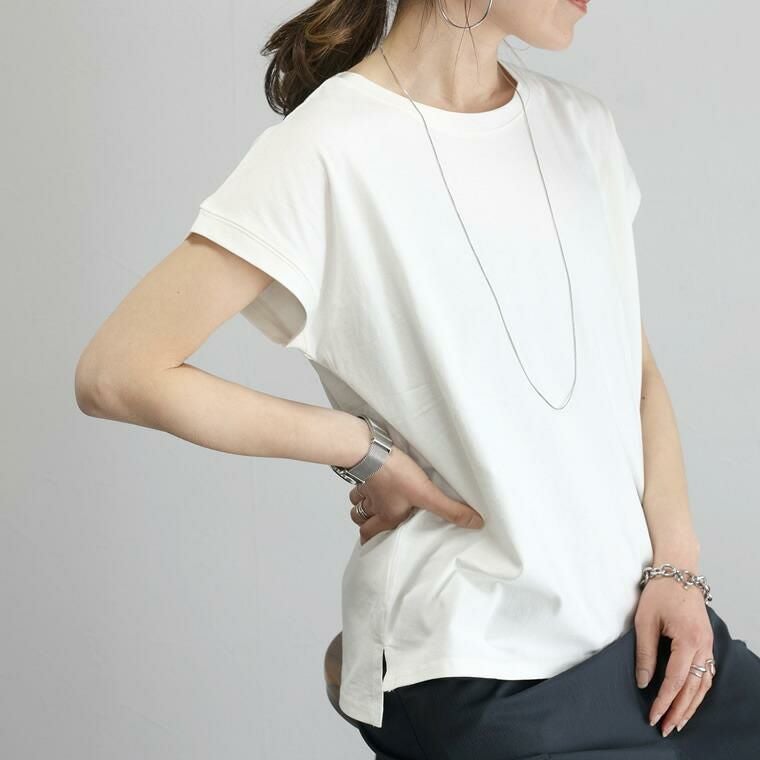 さらっと着られるコットン素材のシンプルカットソー。体のラインを拾いづらいゆとりをもたせたスクエアシルエットに、肩の出過ぎないフレンチスリーブ。ベーシックでありながらも、大人の女性が着ることに考慮し気になる部分をカバーしてくれるデザインが嬉しい。上から羽織りも重ねやすく長い季節着まわせます。デイリーコーデはもちろん、ジャケットのINに合わせれば、オフィスカジュアルにも活躍します。
