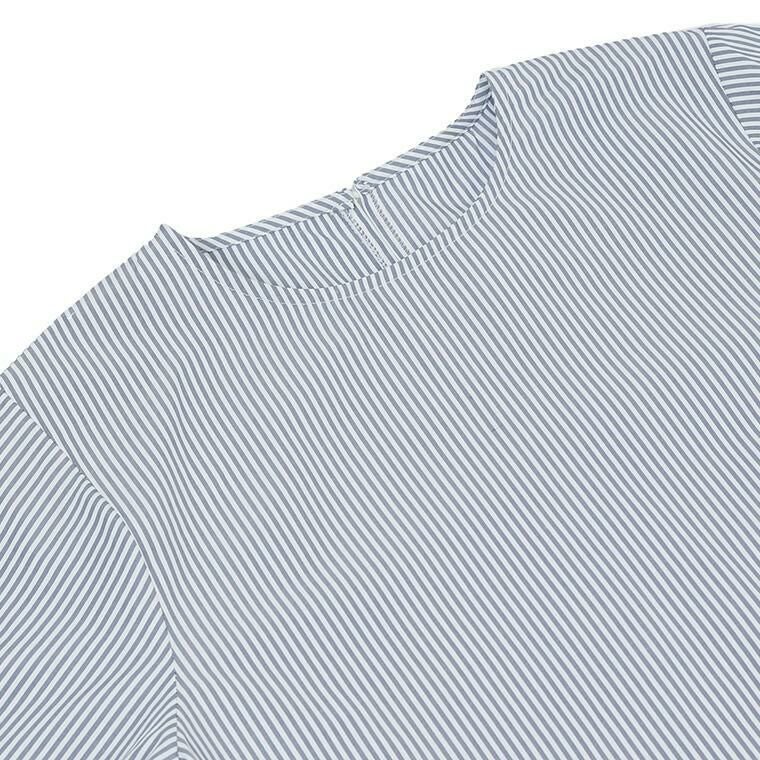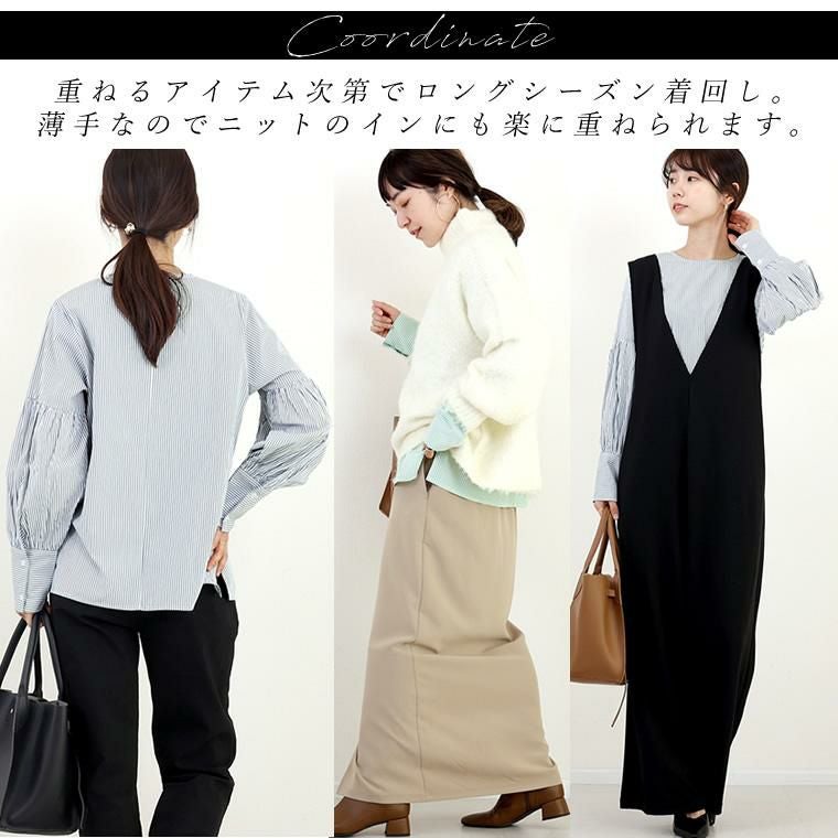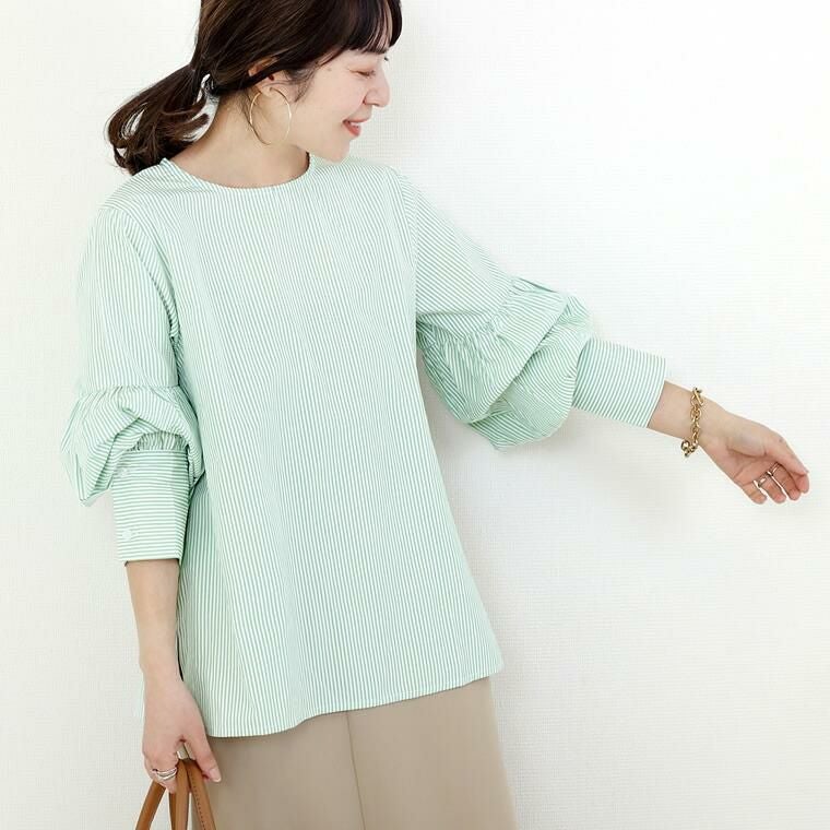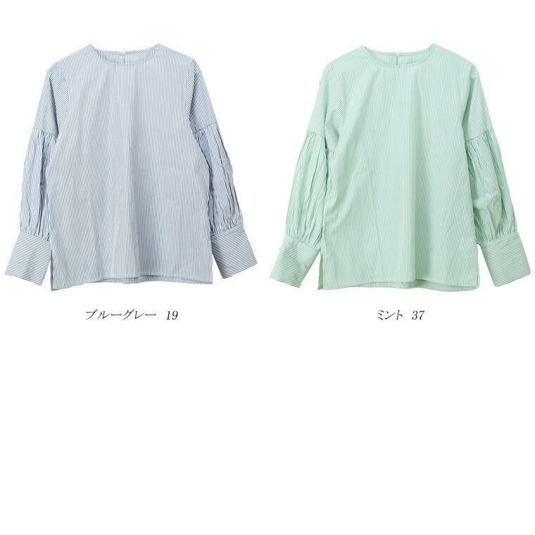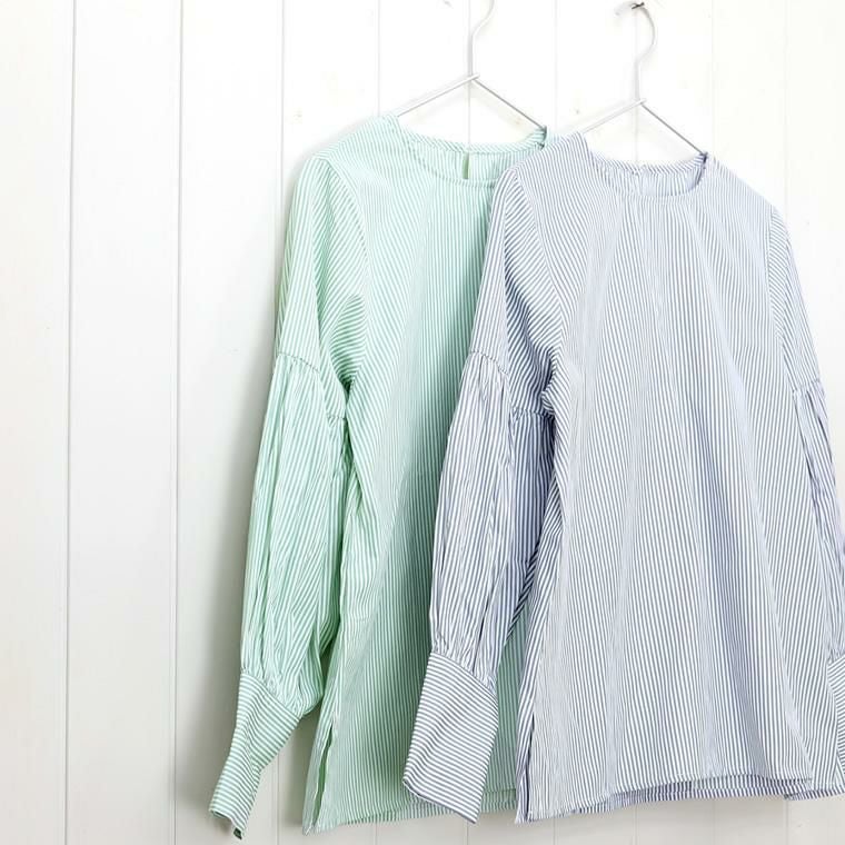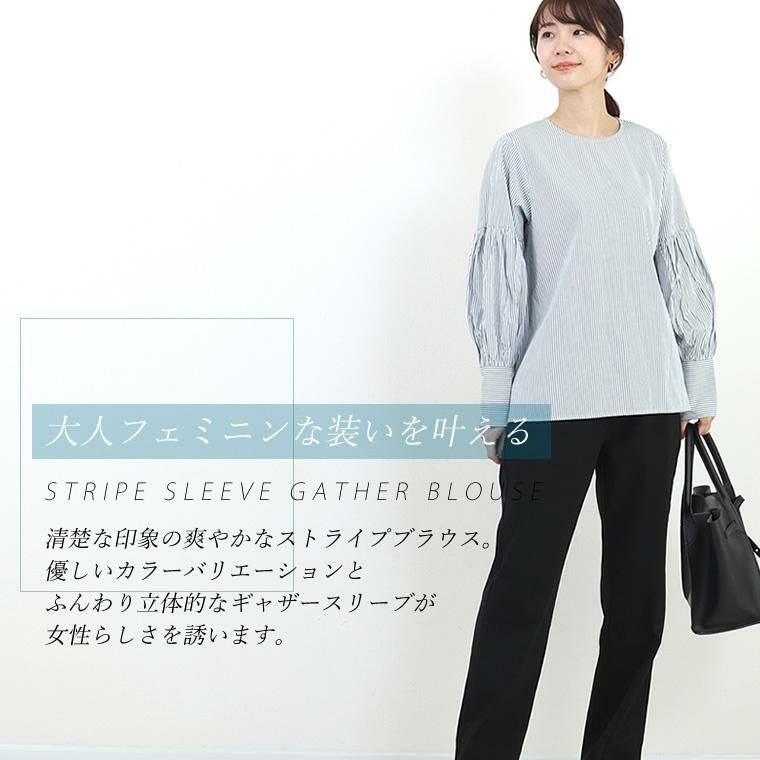 T/Cストライプサイドスリット袖ギャザーブラウス 清楚な印象を与えてくれる爽やかなストライプブラウス。 細めのストライプ柄と優しい色使いで、女性らしさときちんと感を同時に取得。 顔まわりをパッと明るくみせてくれる効果も。無地ボトムに合わせるだけで 簡単にコーディネートが完成します。袖にはたっぷりとギャザーをあしらい ぽわんとした立体シルエットに。袖をたくし上げればお好みのボリューム感を 楽しめます。一枚ではもちろん、サロペットのインや、冬はニットとのレイヤードも。 着こなしに合わせて3シーズン活躍するデザインブラウスです。