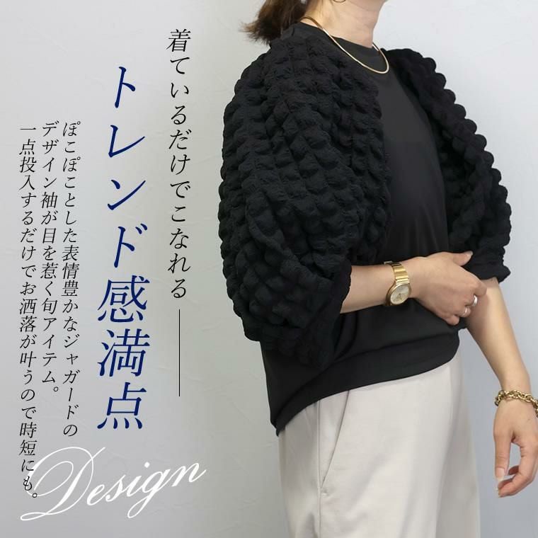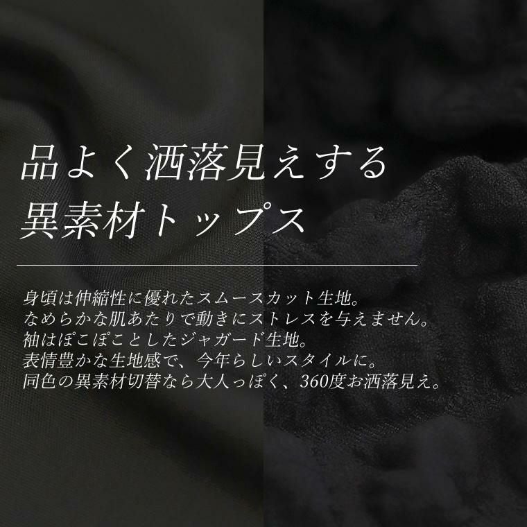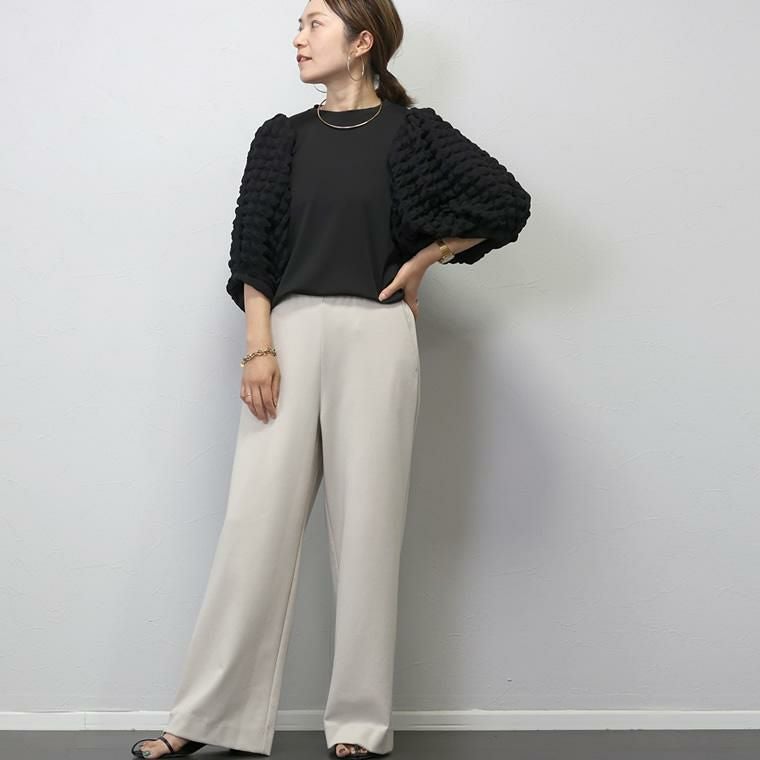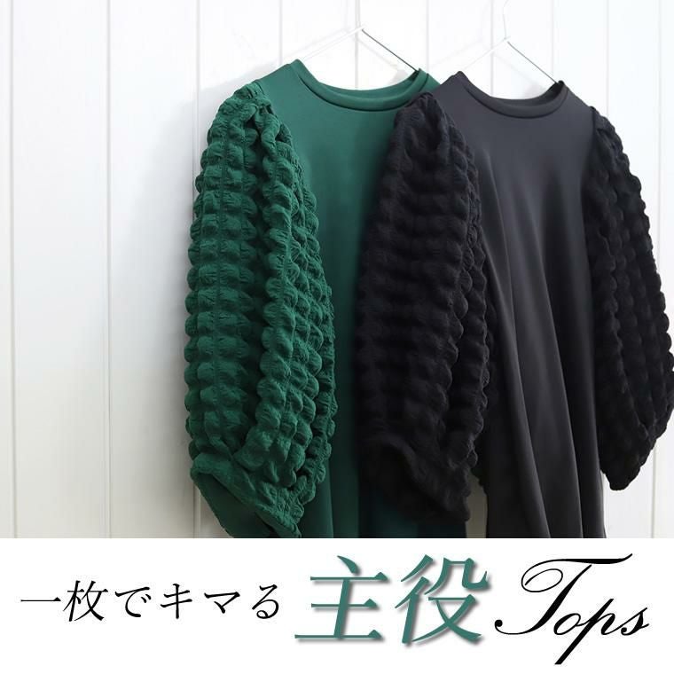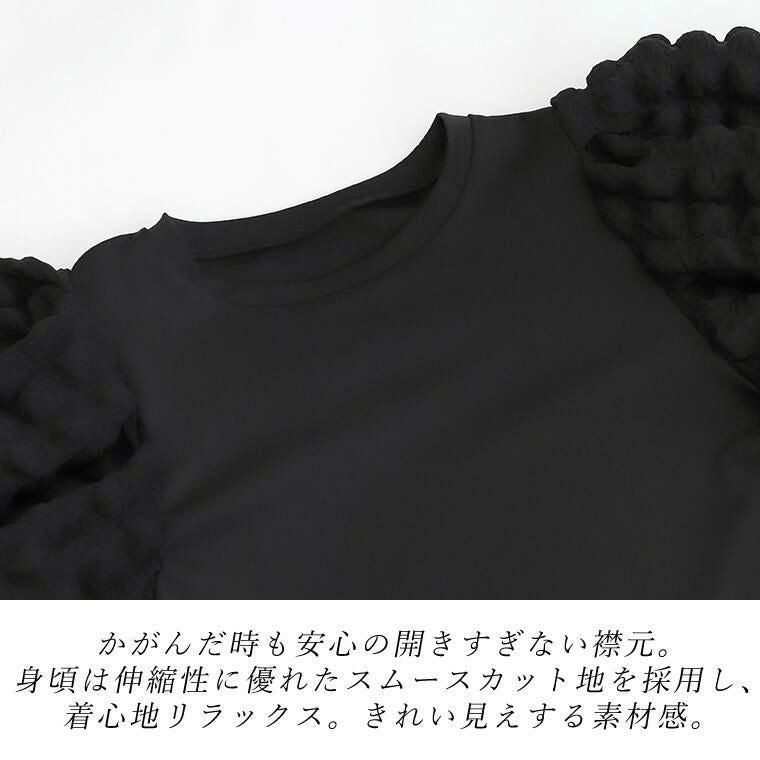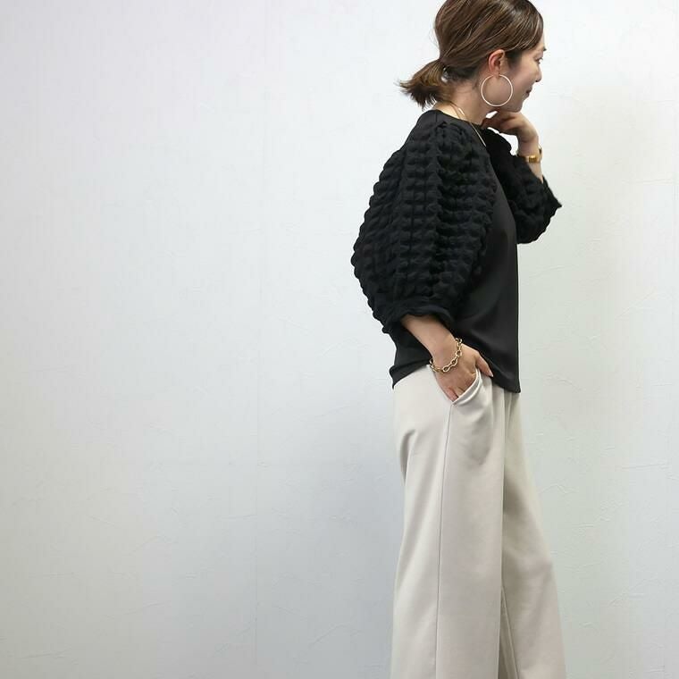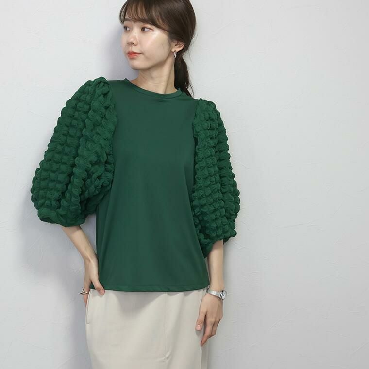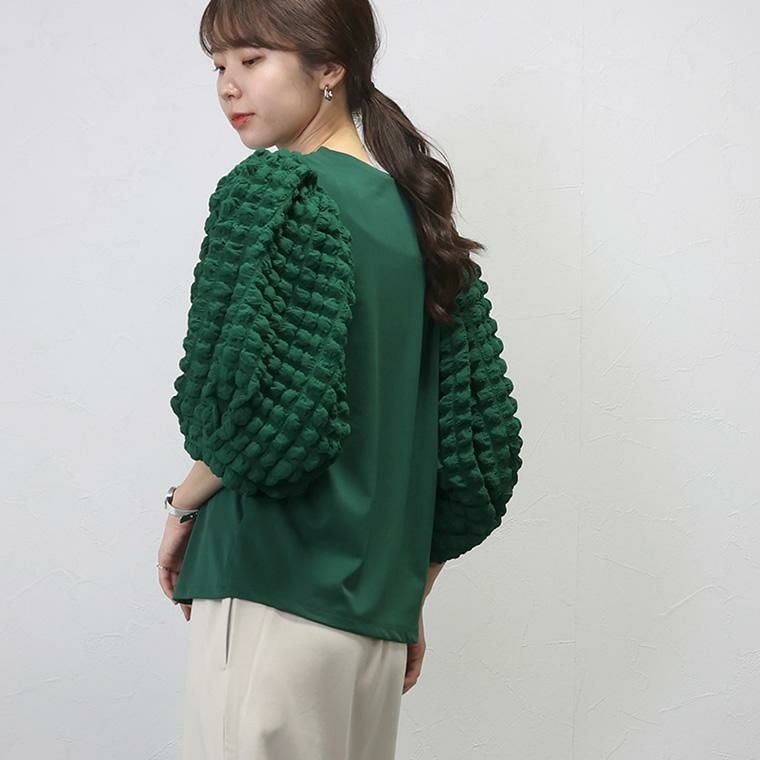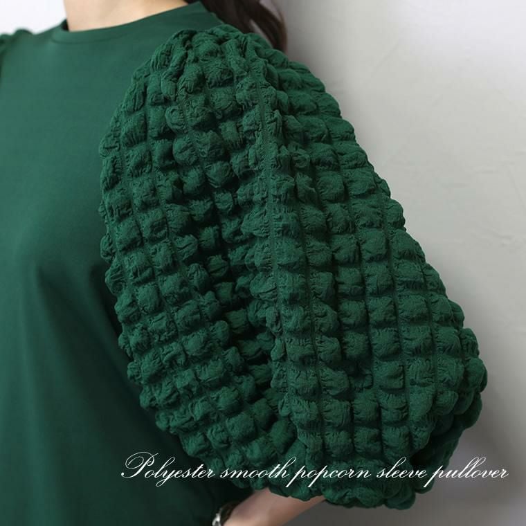 エステルスムースポップコーンスリーブプルオーバー ぽこぽことした袖のボリューム感が目を惹くトレンドトップス。 生地の表面感がユニークなポップコーン生地がコーデの鮮度を上げる 主役アイテムです。身頃はなめらかなスムースカット生地に切替え、 体全体のボリュームを抑え大人が取り入れやすいデザインに。 伸縮性にも優れ着心地も快適です。一枚ではもちろん、サロペットなどの インにもおすすめです。ダークトーンの同色切替が品よくコーデにも 取り入れやすい。今年らしい着こなしを楽しめるデザイントップスです。