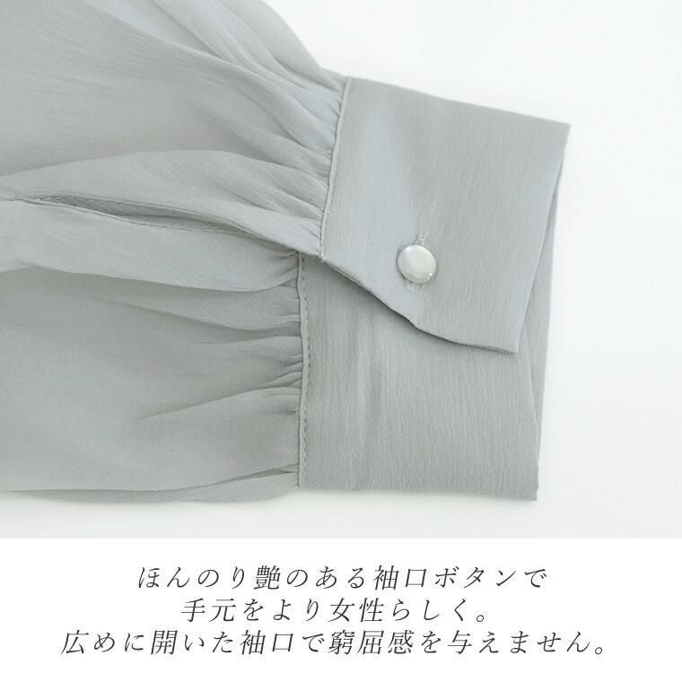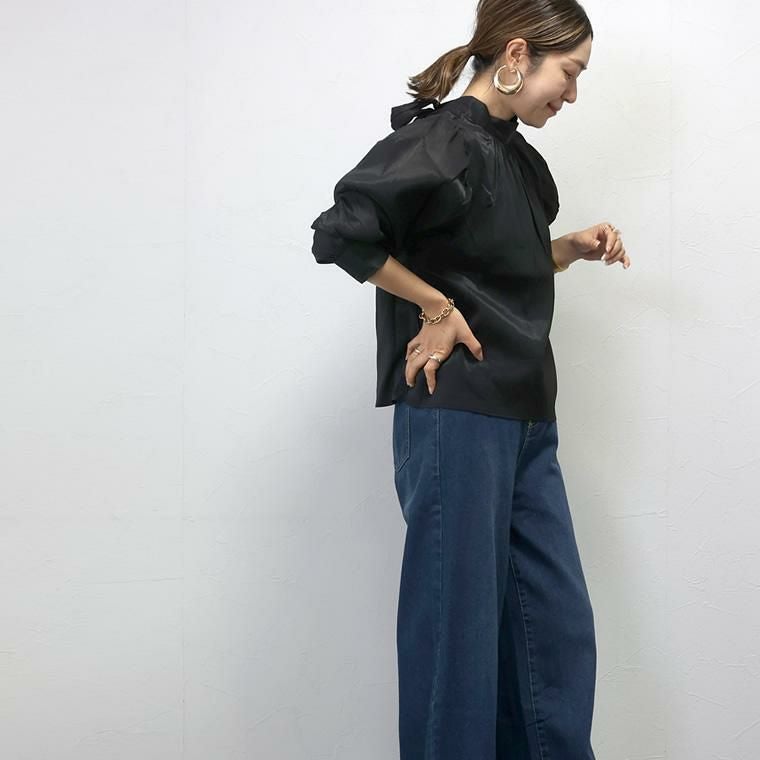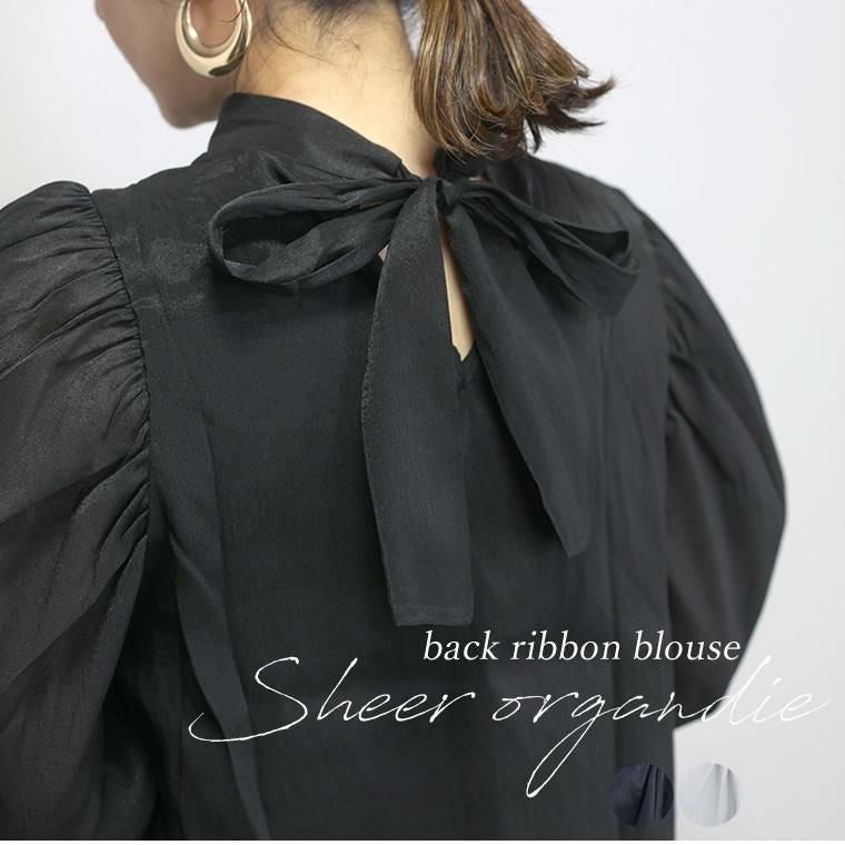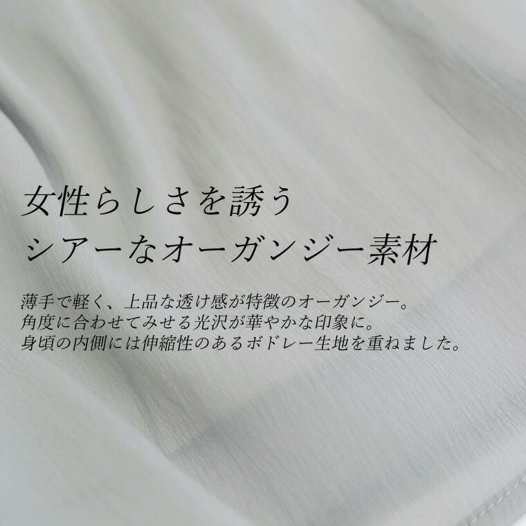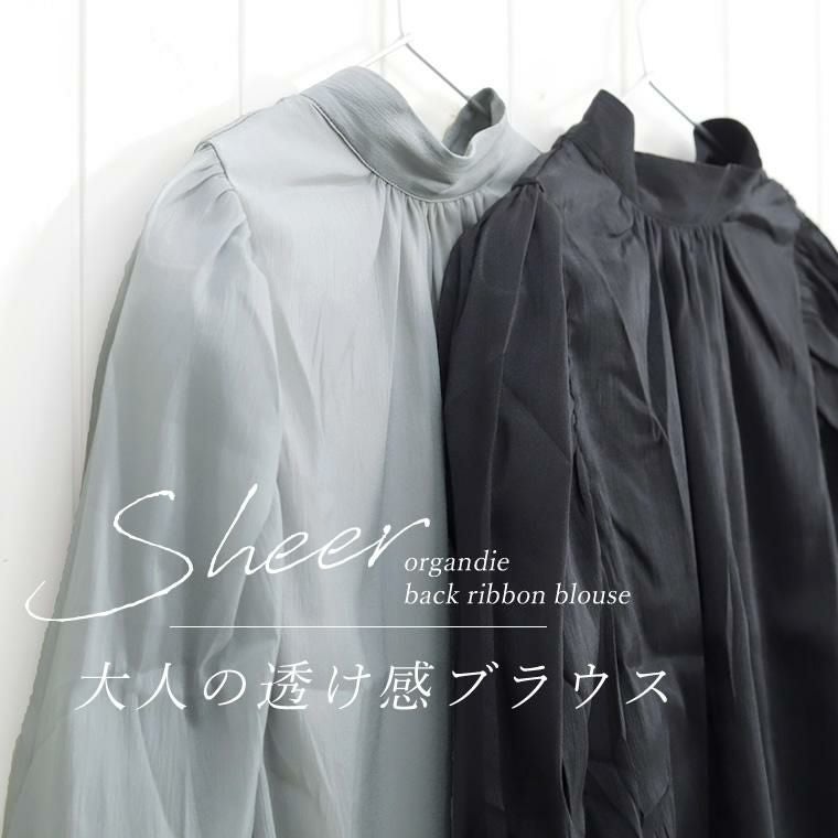 シアーオーガンジー後ろリボンブラウス 優しい透け感が今年らしい、オーガンジー生地で仕立てた シアーブラウス。ふわっと軽く、肌馴染みのよいシースルー感が 女性らしさを引き立てます。ぽわんとしたボリュームのあるデザイン袖は 一枚ではもちろん、サロペットなどのインにもおすすめ。たっぷり寄せられた 肩と袖口のギャザーが自然な立体シルエットを作り、気になる二の腕も カモフラージュしてくれます。後ろを振りむけば大人フェミニンなリボンが 目を惹く。身生地と同素材で甘くなりすぎないようこだわっています。 普段使いはもちろん特別な日も着たい、デザインブラウスです。