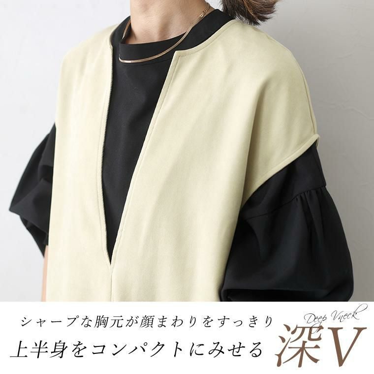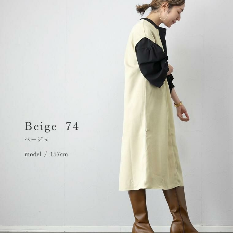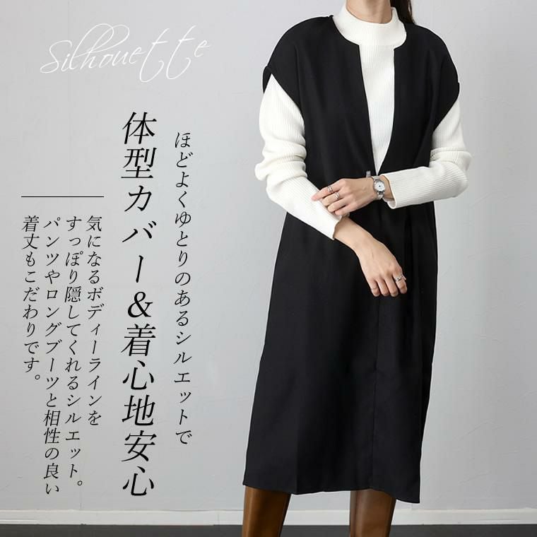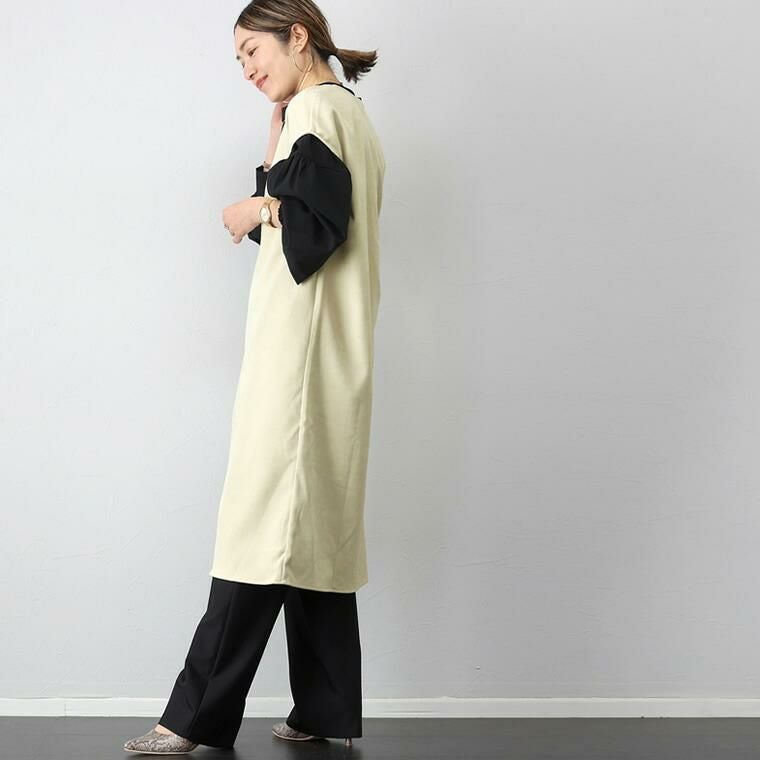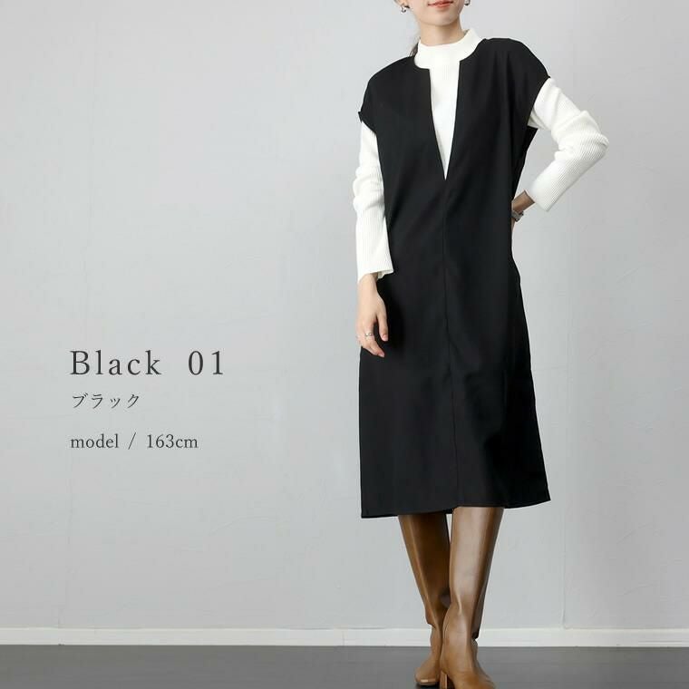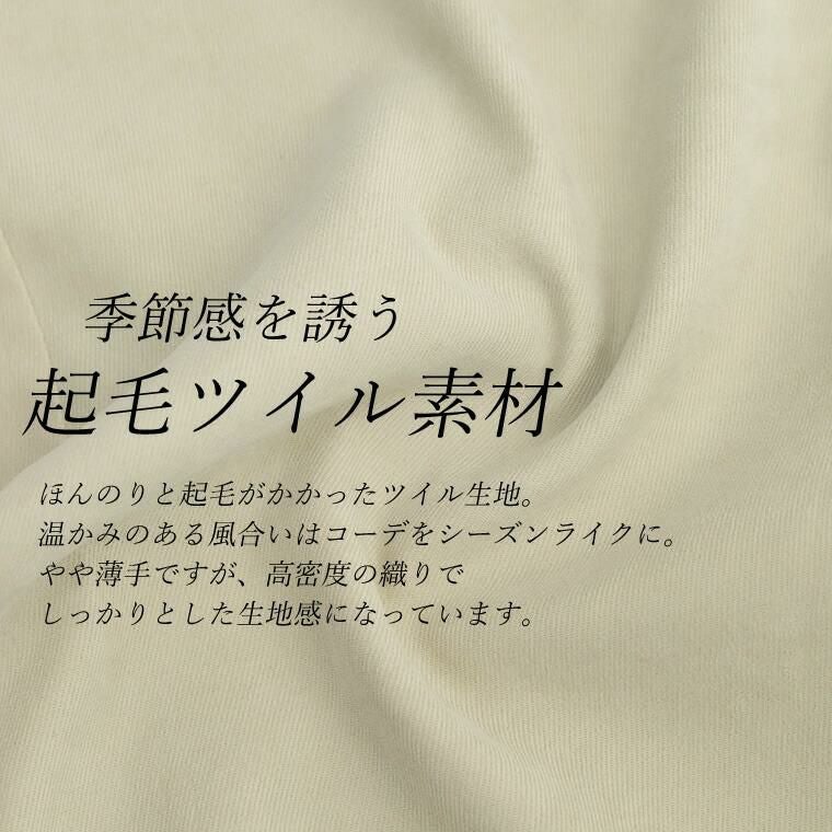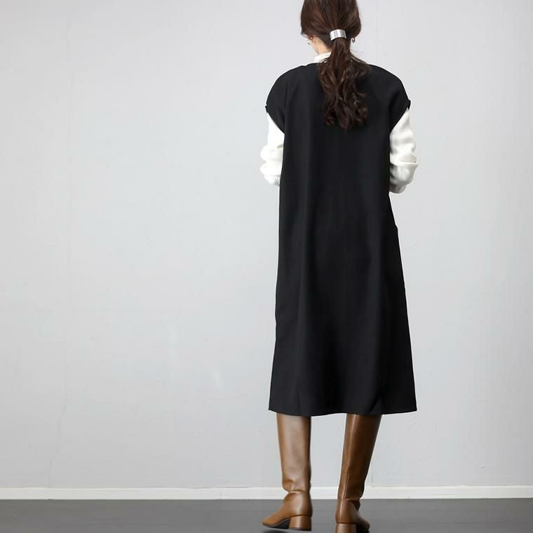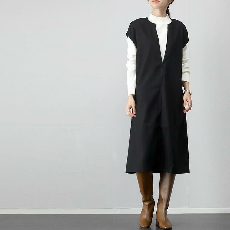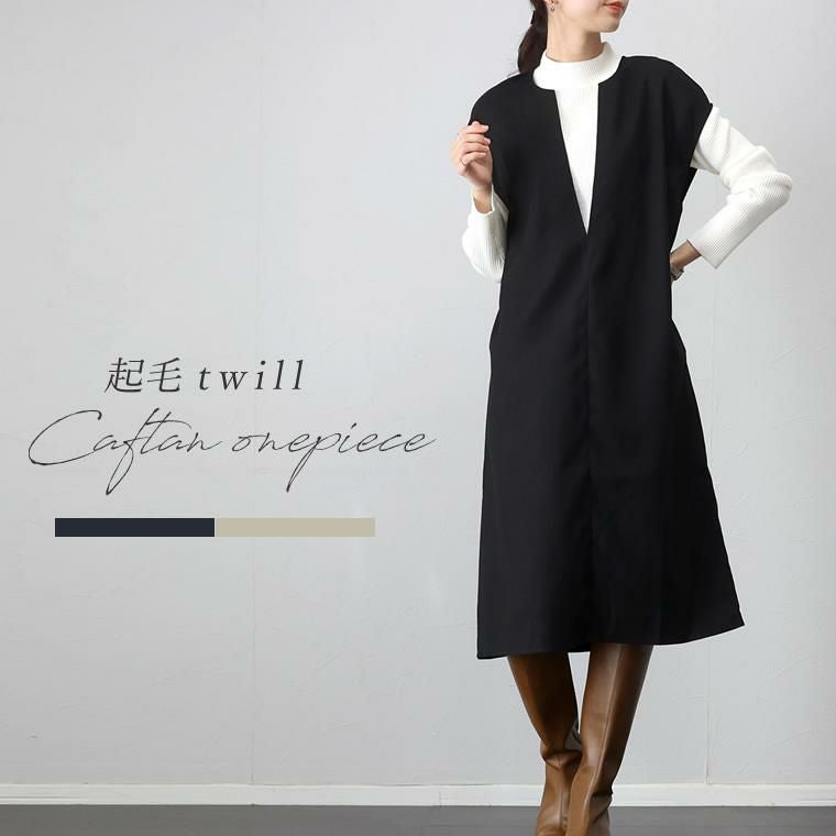 起毛ツイルカフタンワンピース ほんのりと起毛がかかったツイル生地で仕立てた 重ね着専用のワンピース。表面の優しい起毛感がシーズンライクな コーディネートに仕上げます。胸元に深いVを描くフロントのデザインは 顔まわりをすっきり見せ、上半身をコンパクトに見せてくれる効果も。 縦のラインを作りシャープに、洗練ムード漂うデザインが大人に似合います。 シンプルなカットソーからタートル、袖ボリュームトップスなど 合わせるアイテム次第で表情を楽しめる着回し力のあるアイテムです。