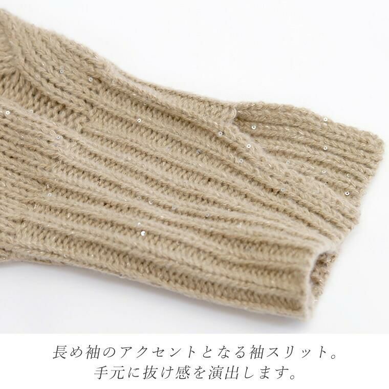 スリット糸ケーブル編みVネックプルオーバー 全体に散りばめられたスパンコールがエレガント、 トレンドムードを高めるニットプルオーバー。 素材は厚みのある3Gニットを採用。大柄のケーブル編みと 煌めくラメ感が華やかさを演出して一枚できちんと着映えます。 ワイドなシルエットとシャープなVネックが、女性らしい抜け感ある印象。 長めの袖リブにはスリットが施されて手元を華奢に見せます。 着丈は長めの安心デザイン、ゆるいシルエットが魅力のニットアイテムです。