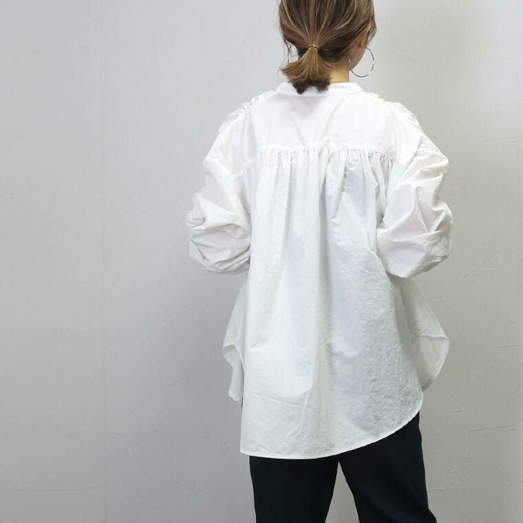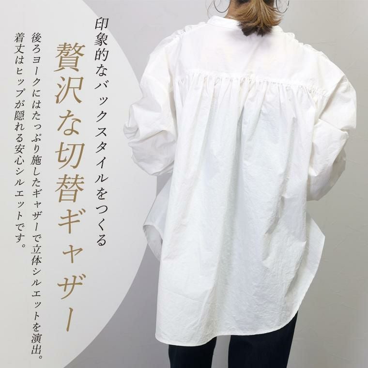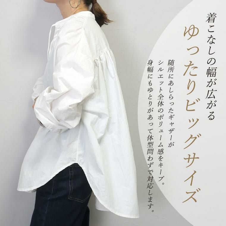 バンドカラーリボン使い後ろギャザーブラウス つよいハリ感で立体的なシルエットで着られるブラウス。 身体のラインを沿わないから体型カバーしつつ、こなれ感あるシルエットをキープします。 生地全体にはシワ加工が施されて、ノーアイロンで着用可能。 襟元の細リボンがスタイルのアクセントとなります。 後ろ・肩・袖口にはたっぷりギャザーを寄せてドレープ感をプラス。 ゆったりしたサイジングが魅力で、体型カバーしながらトレンドも楽しめるアイテムです。