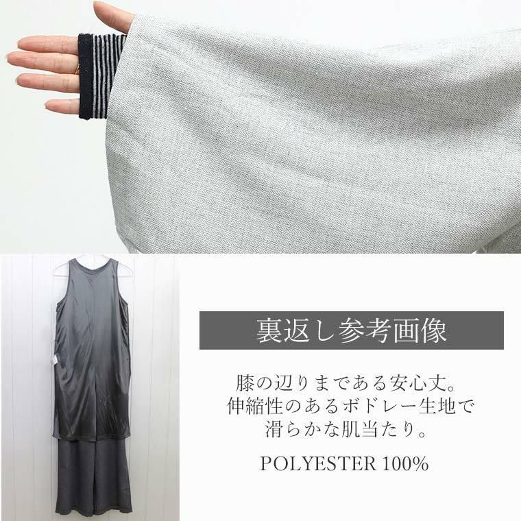 着丈はくるぶしが隠れるくらい。伸縮性はありませんが身幅にゆとりがありキツさは感じませんでした。着丈が少し短いです。首まわりは狭めで少し詰まった感じがありました。