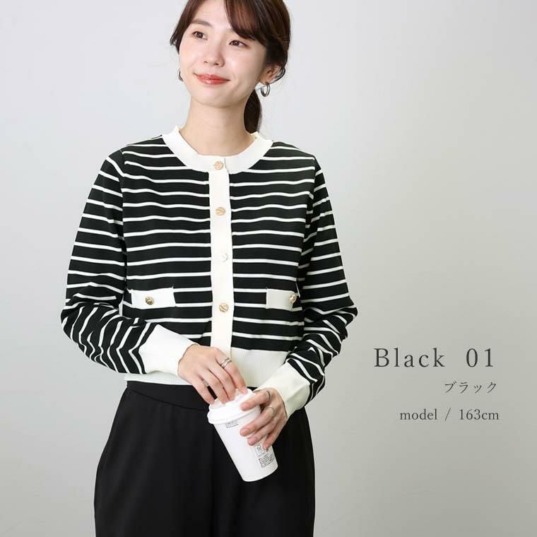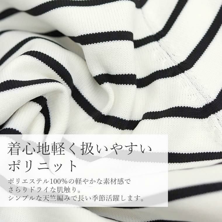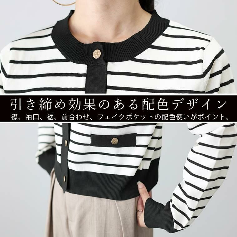 さらり軽い着心地が自慢、ポリエステル100%のニットカーディガン。伸縮性に優れたドライな風合いで長い季節対応、扱いやすい素材感が魅力です。カジュアルライクなボーダーアイテムですが、襟、裾、袖口、前合わせ、フェイクポケットの配色使いでクラシカルな印象に。さらに凹凸感のあるゴールドのメタルボタンが上品な表情をみせます。春先まで活躍する大人のボーダーニットカーディガンです。