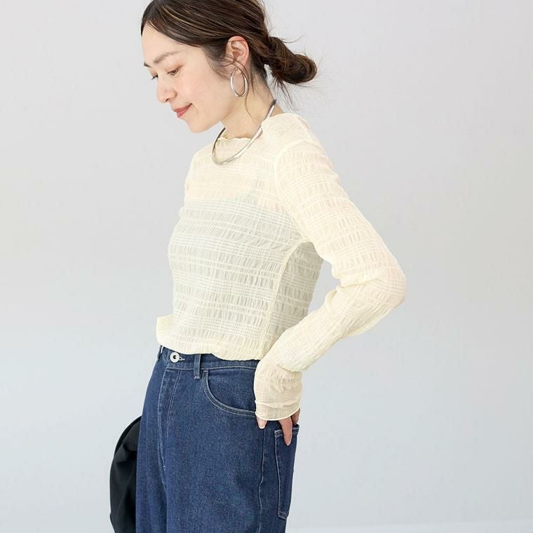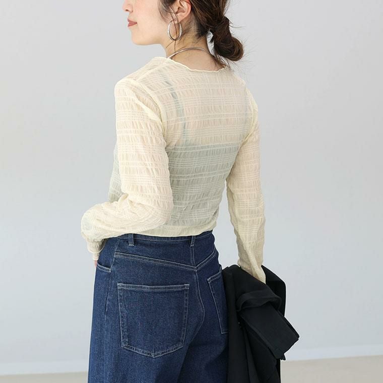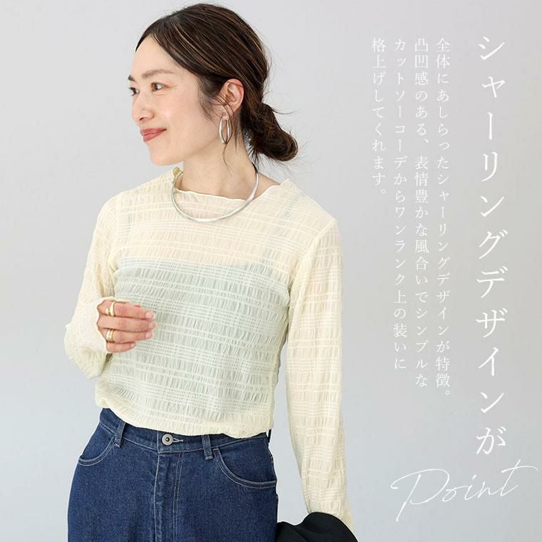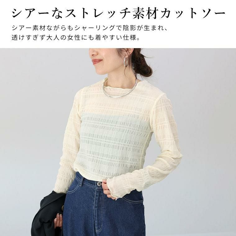 シアーなストレッチ素材で仕立てた、薄手のカットソー。全体にあしらったシャーリングデザインが特徴。凸凹感のある、表情豊かな風合いで、シンプルなカットソーコーデからワンランク上の装いに格上げしてくれます。シアーな素材ながらもシャーリングで陰影が生まれることで、透けすぎず大人の女性にも着やすい仕様です。襟元・袖口・裾は緩やかに湾曲するメロー仕様。女性らしい印象です。伸縮性に優れており、程よくフィットする着心地良い素材感です。キャミソールなどを合わせて一枚でも、またベストやジャケットのインにも役立つアイテムです。