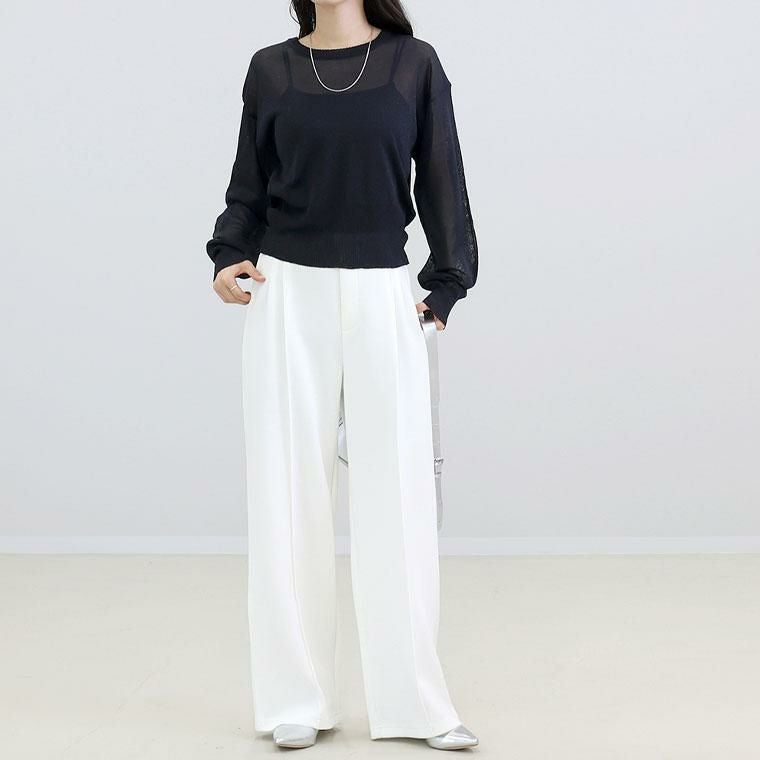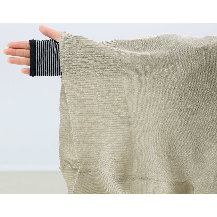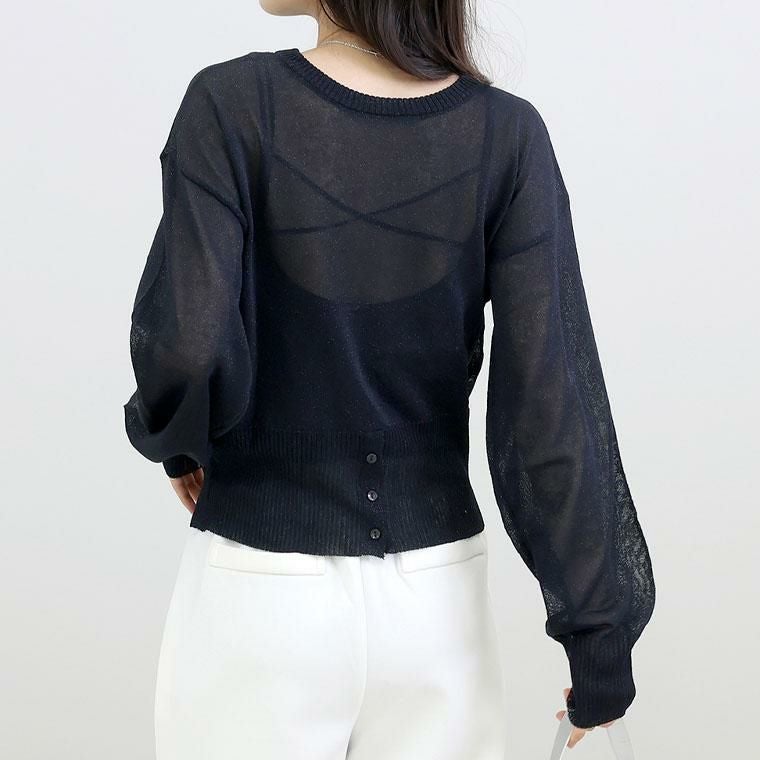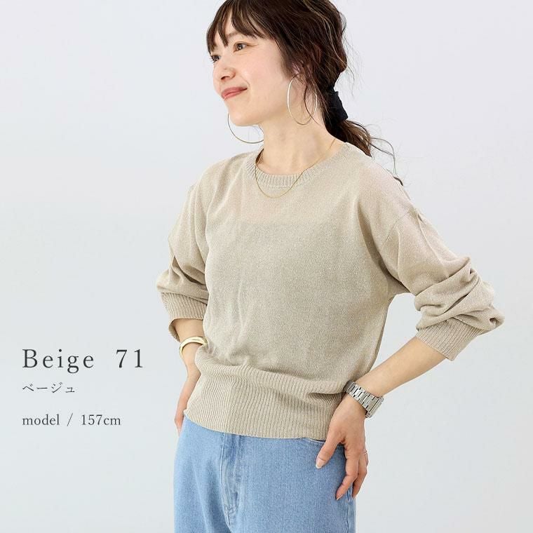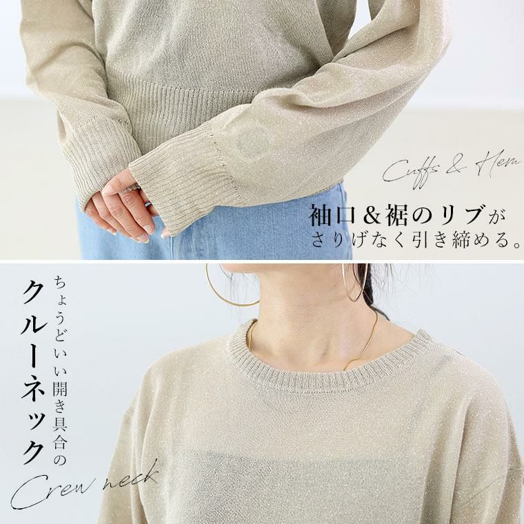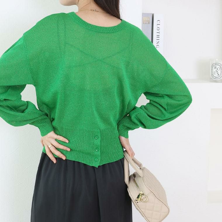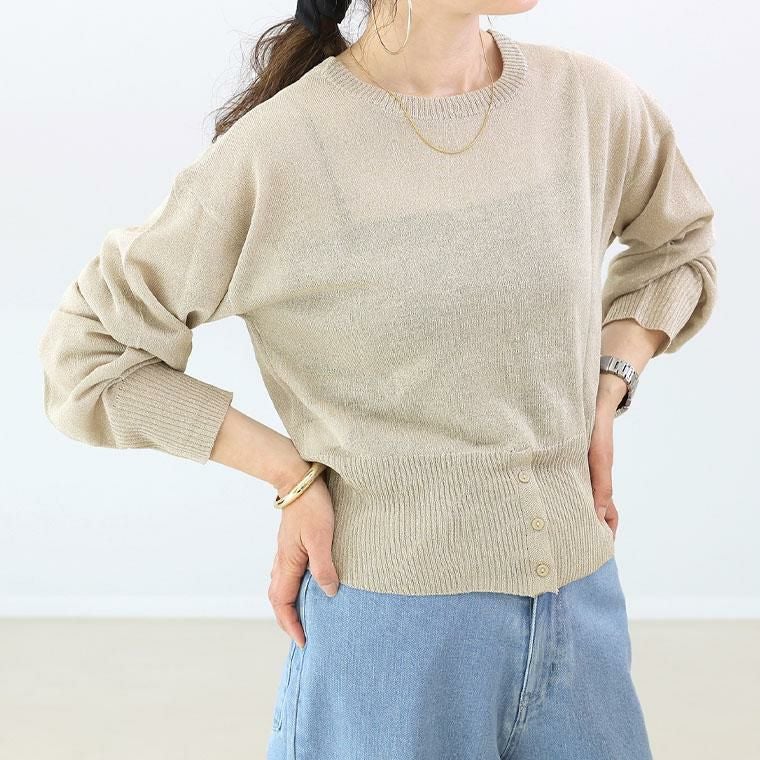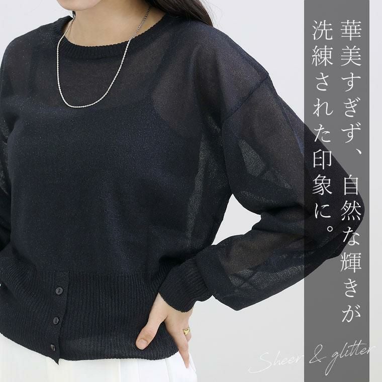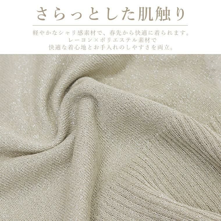 春の日差しに映える、ほんのりラメが美しいニットです。繊細なラメが上品な華やかさをアピール。華美すぎず、自然な輝きが洗練された印象に。その日の気分やシーンい合わせた着こなしが楽しめる2WAY。さらっとした肌触りの軽やかなシャリ感素材で、春先から快適に着られます。レーヨン×ポリエステル素材で快適な着心地とお手入れのしやすさを両立。ハイゲージ編みの上品な質感が、洗練された大人の雰囲気を醸し出します。裾と袖口のリブがさり気なくウエストラインと手首を引き締めます。裾のボタンディティールがシンプルながらも高見えを叶えます。パンツにもスカートにも合わせやすく、オンオフ問わず活躍。