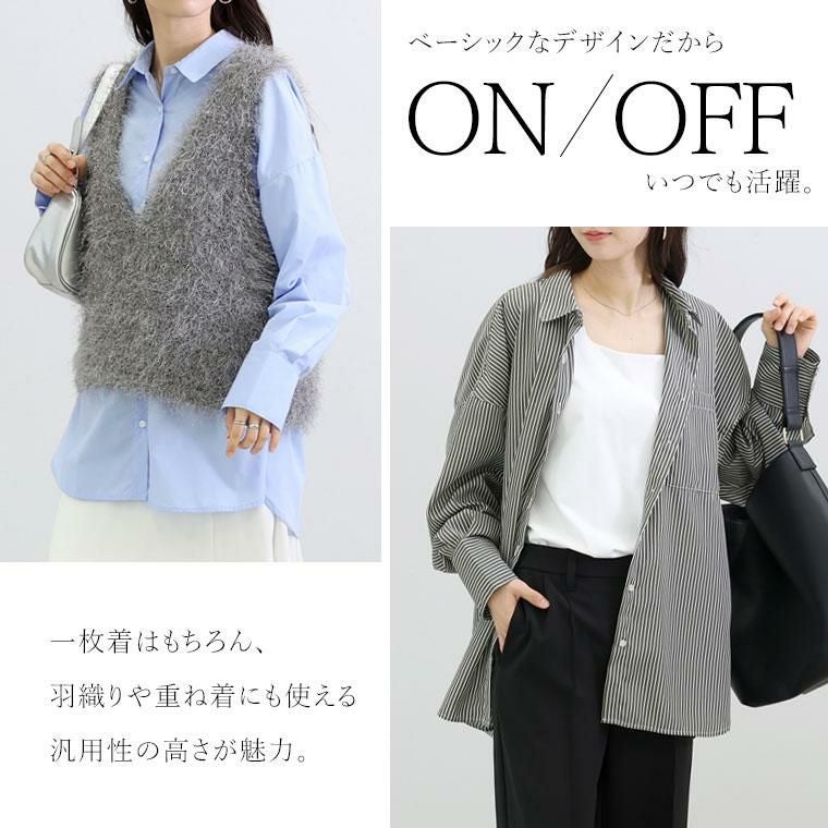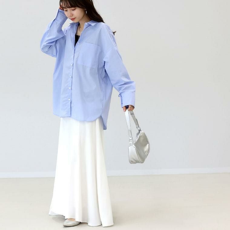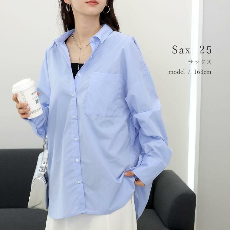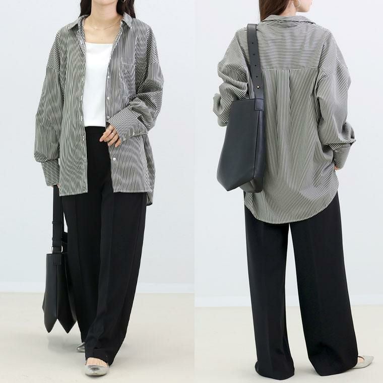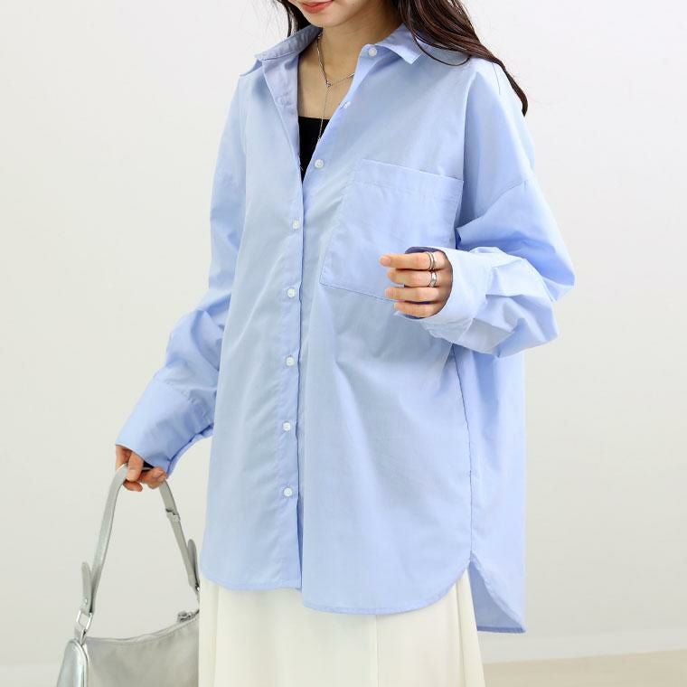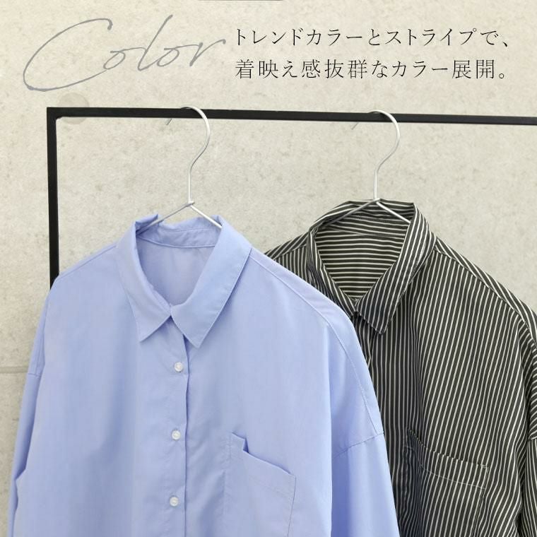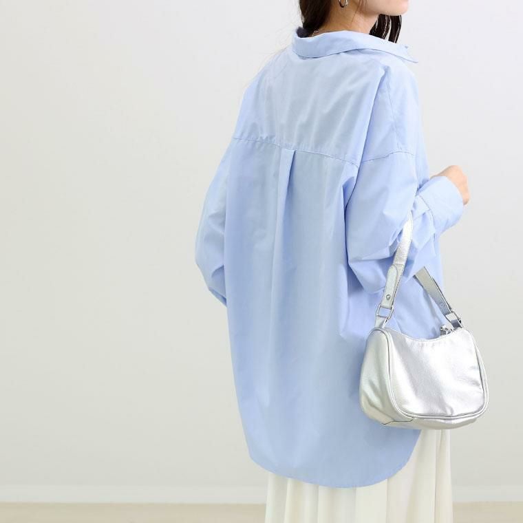 程よいハリ感と艶のあるブロード素材で仕立てた上品シャツ。比較的シワになりづらく美しいシルエットをキープし、オンオフで活躍します。薄手で軽いから羽織りや重ね着としても着用可能。長めのカフスにはダブルボタンをあしらいシックな印象に。袖口にはタックをあしらい立体的なシルエットをつくります。ヒップが隠れる長め着丈なので、体型カバーにも一躍。シンプルなのに洗練されたデザインで、毎日のスタイリングを格上げします。