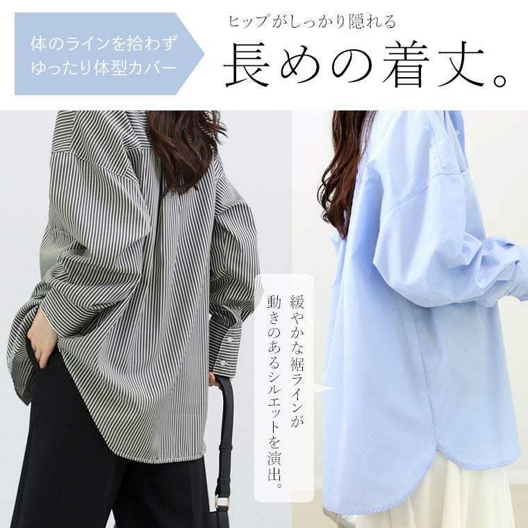 着丈はヒップから15cm下。袖丈は手首から17cm下。シャツですが身幅袖幅にゆとりがあり中に着こんでも窮屈感はありません。着丈が太ももくらいまであるのでコンプレックスが隠せ◎。