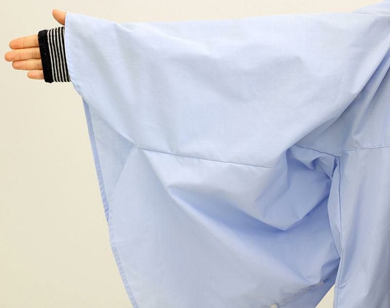 着丈はヒップから12cm下。袖丈は手首から12cm下。伸縮性はありませんが身幅が広く全体的にゆったりしていて窮屈感はありません。袖口は少し緩めで腕まくりをしても止りません。重ね着にも使いやすい薄さです。
