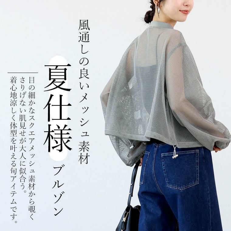 風通しの良いメッシュ素材で蒸し暑い季節も快適に。目の細かなスクエアメッシュで仕立てたシアーブルゾン。夏仕様の軽やかな見た目でシーズンライクな着こなしに。ゆったりと羽織れるワイドな身幅でラフな印象、裾を絞っても着られるドロストデザインでシルエットの変化も楽しめます。目を惹く両ポケットがアクセント。さらにフロントのファスナーは上下どちらからも開けることのできるダブルジップで、裾を少し開けて抜け感をプラスするスタイリングもおすすめです。スポーティーになり過ぎず、大人の日常に馴染む一枚です。