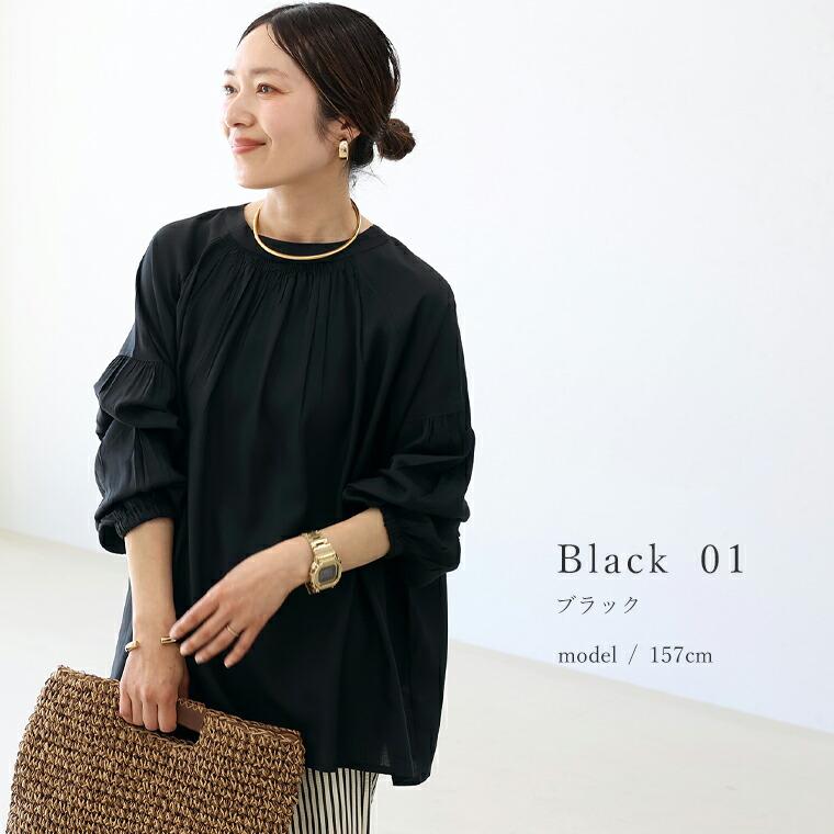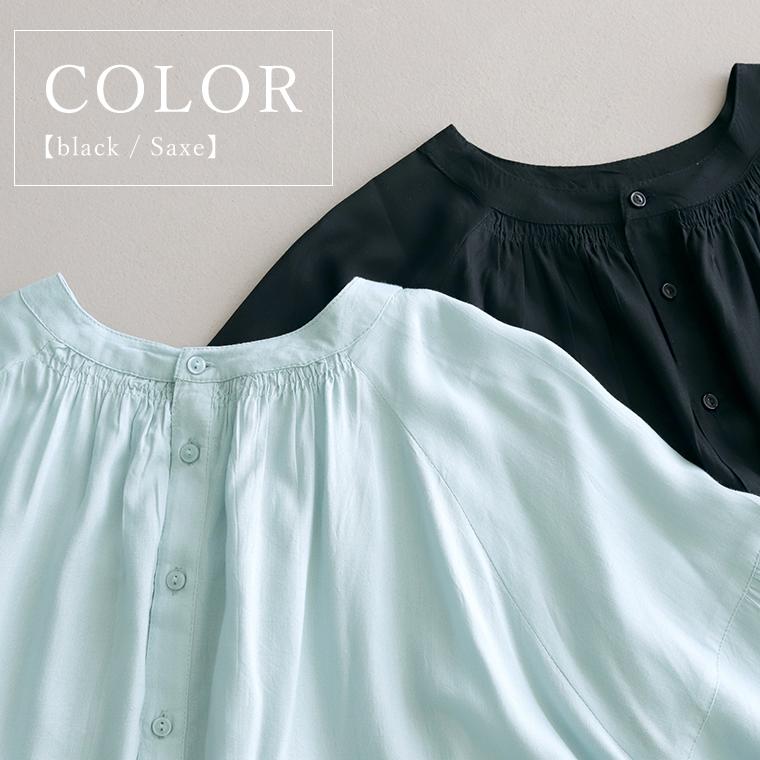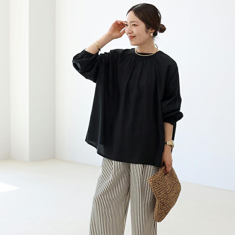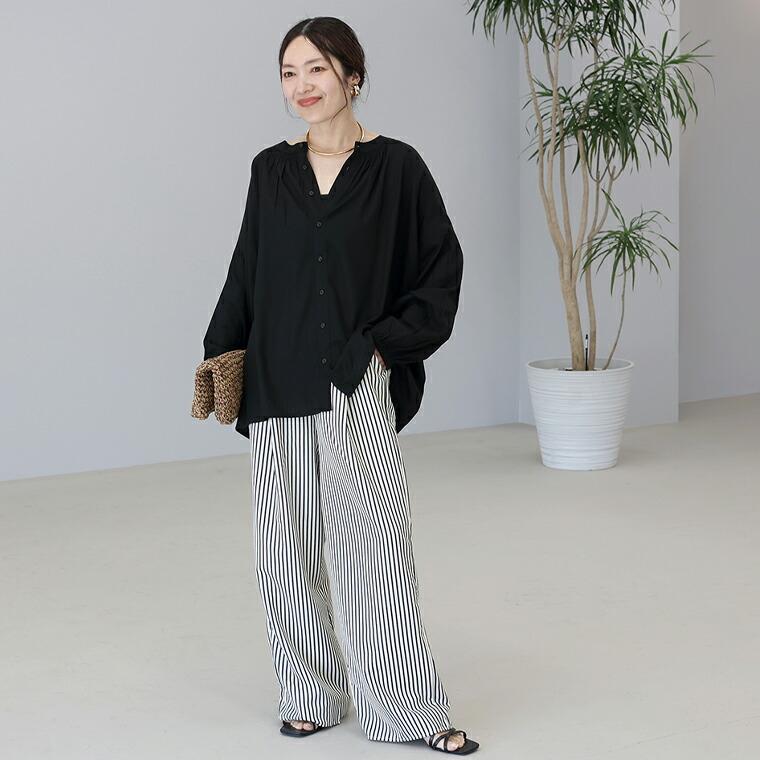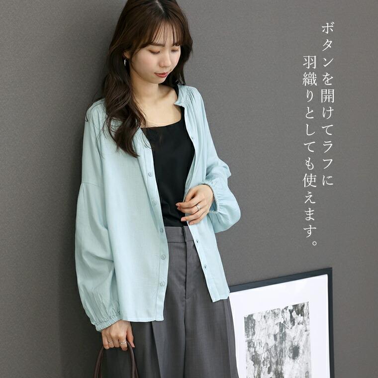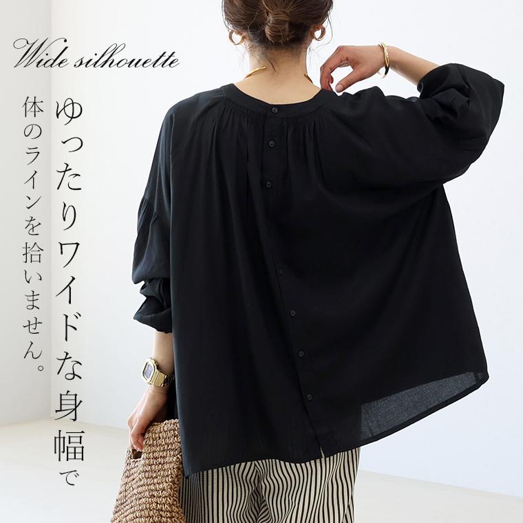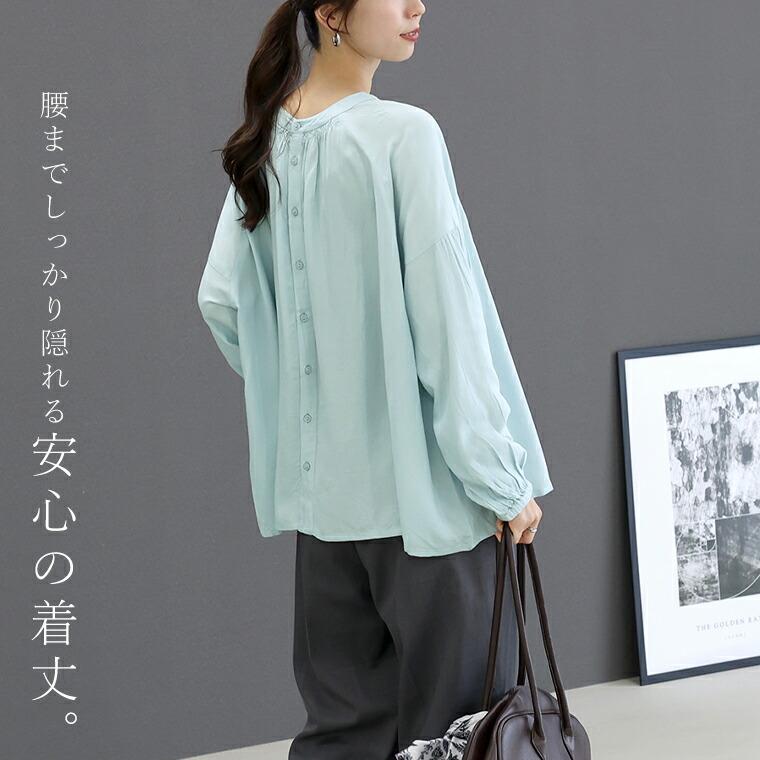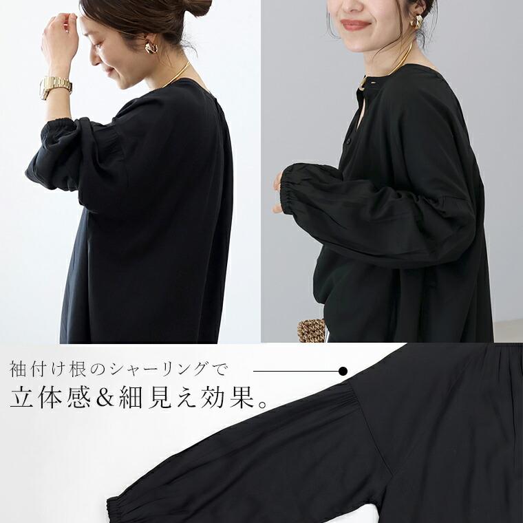 たっぷりと生地を使った贅沢なシルエットに、繊細なシャーリングを効かせた前後2WAYブラウス。とろみのあるレーヨン素材が動くたびに揺れ、自然と女性らしい印象に。ボタンを開けて抜き気味に着るだけで、こなれた大人のスタイルが完成します。前後どちらでも着られる2WAY仕様で着回し自在。ボタンを前にすればバンドカラーで甘すぎずすっきりした印象に。前後の襟元シャーリングが顔まわりを華やかに。袖付け根のシャーリングで立体感&細見え効果。ゆったりワイドな身幅で身体のラインを拾いません。腰までしっかり隠れる安心の着丈。袖口ゴムでたくし上げやすく抜け感も簡単に。ボタンを開けてラフに羽織りとしても使えます。きれいめにもカジュアルにも振れる万能デザイン。