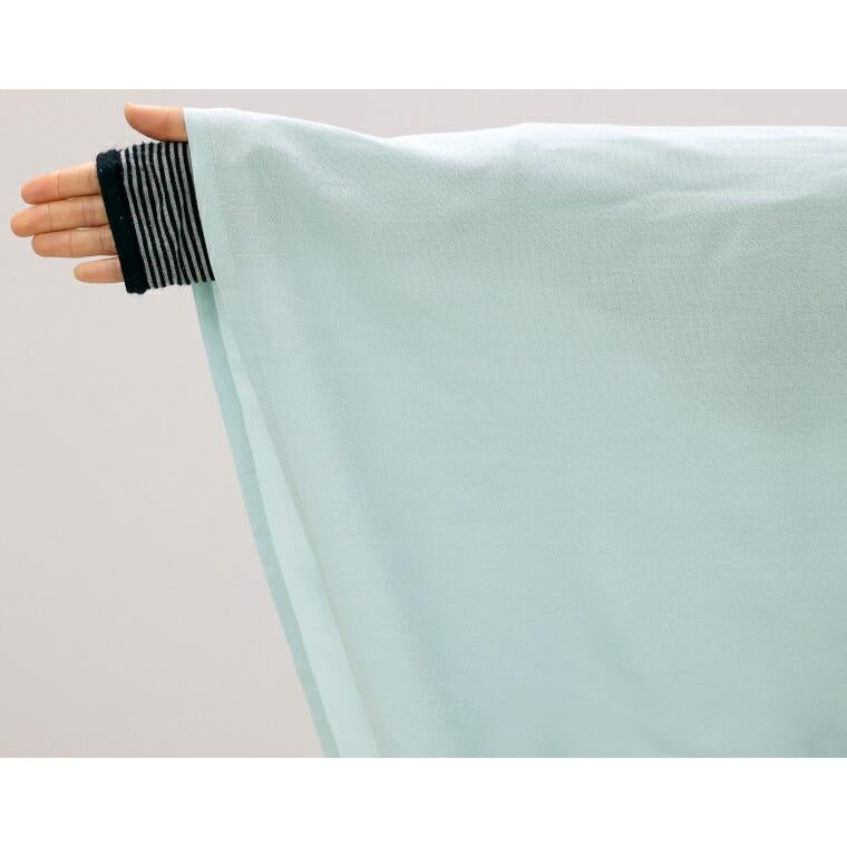 着丈はヒップが3分の2隠れるくらい。袖丈は手首から9cm下。伸縮性はありませんが身頃にとてもゆとりがあります。首元にはギャザーがたくさん入っていてふんわりシルエット◎。袖口のゴムは柔らかく窮屈感なく、伸ばすと手の甲の半分くらい隠れます。