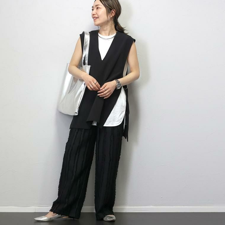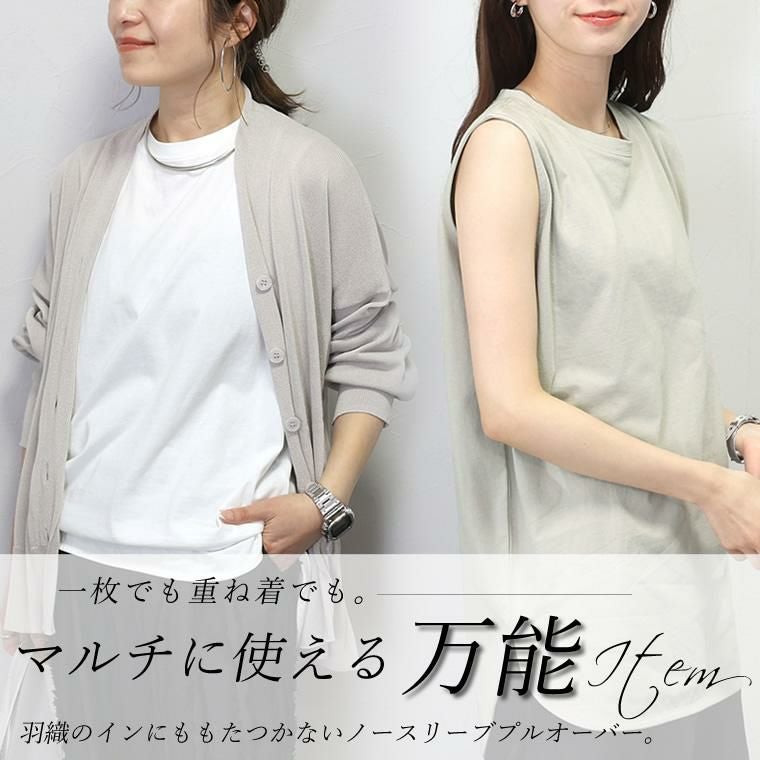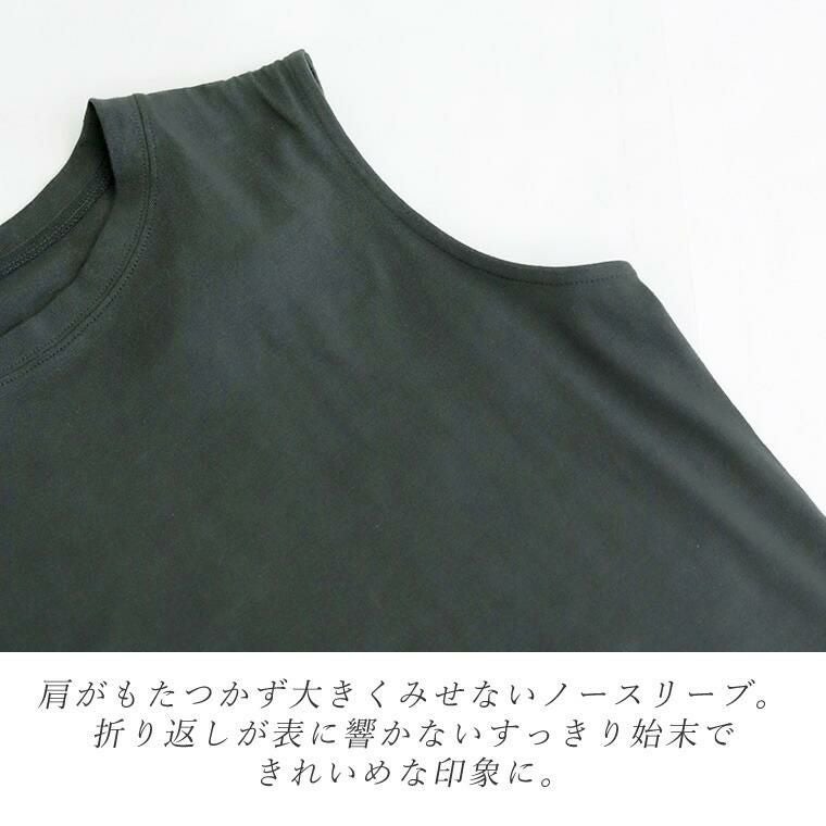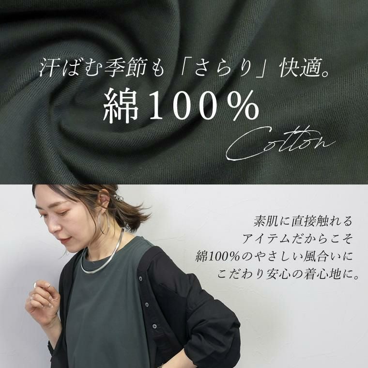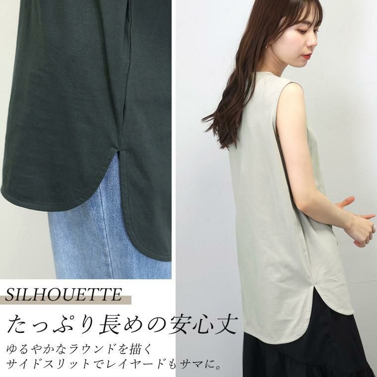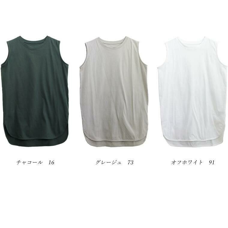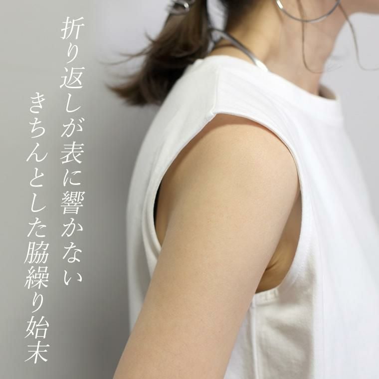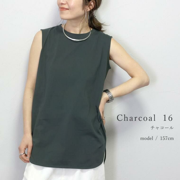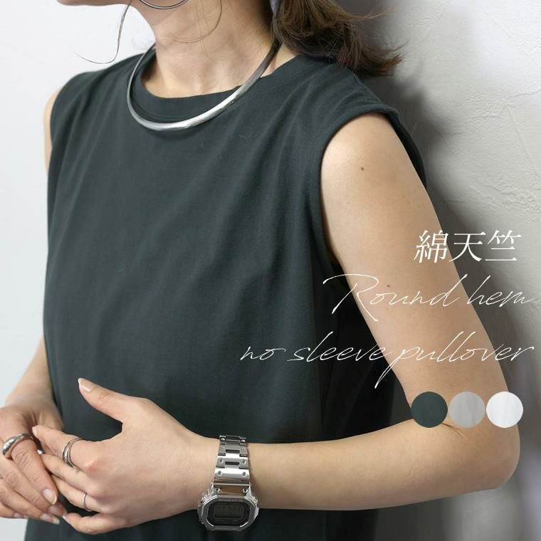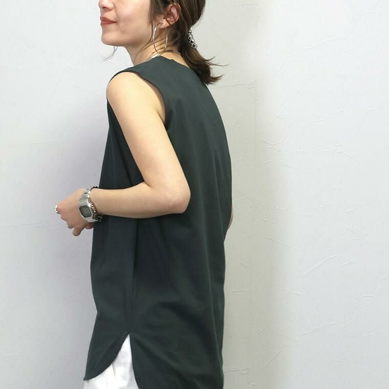 ラウンドヘム綿天竺ノースリーブプルオーバー 一枚ではもちろん、羽織りのINやベストやサロペットなどの重ね着におすすめしたい 年中活躍するノースリーブタンクトップ。素肌に直接着られる綿100%の 天竺素材で、着心地もリラックス。厚すぎない生地でさらっと着られるうえ、 ノースリーブシルエットなので上からトップスを重ねた際も肩が大きく見えません。 緩やかなラウンドを描く裾のラインやスリットなど、シンプルながらもディテールに こだわり、きれいめにランクアップ。マルチな着こなしに活躍する万能アイテム。