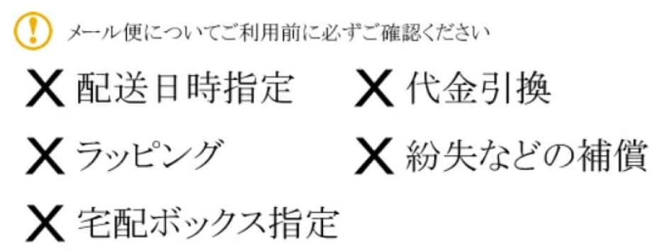 ご注文の際にメール便をご選択いただいていても発送時には宅配便となりますのでご了承ください。